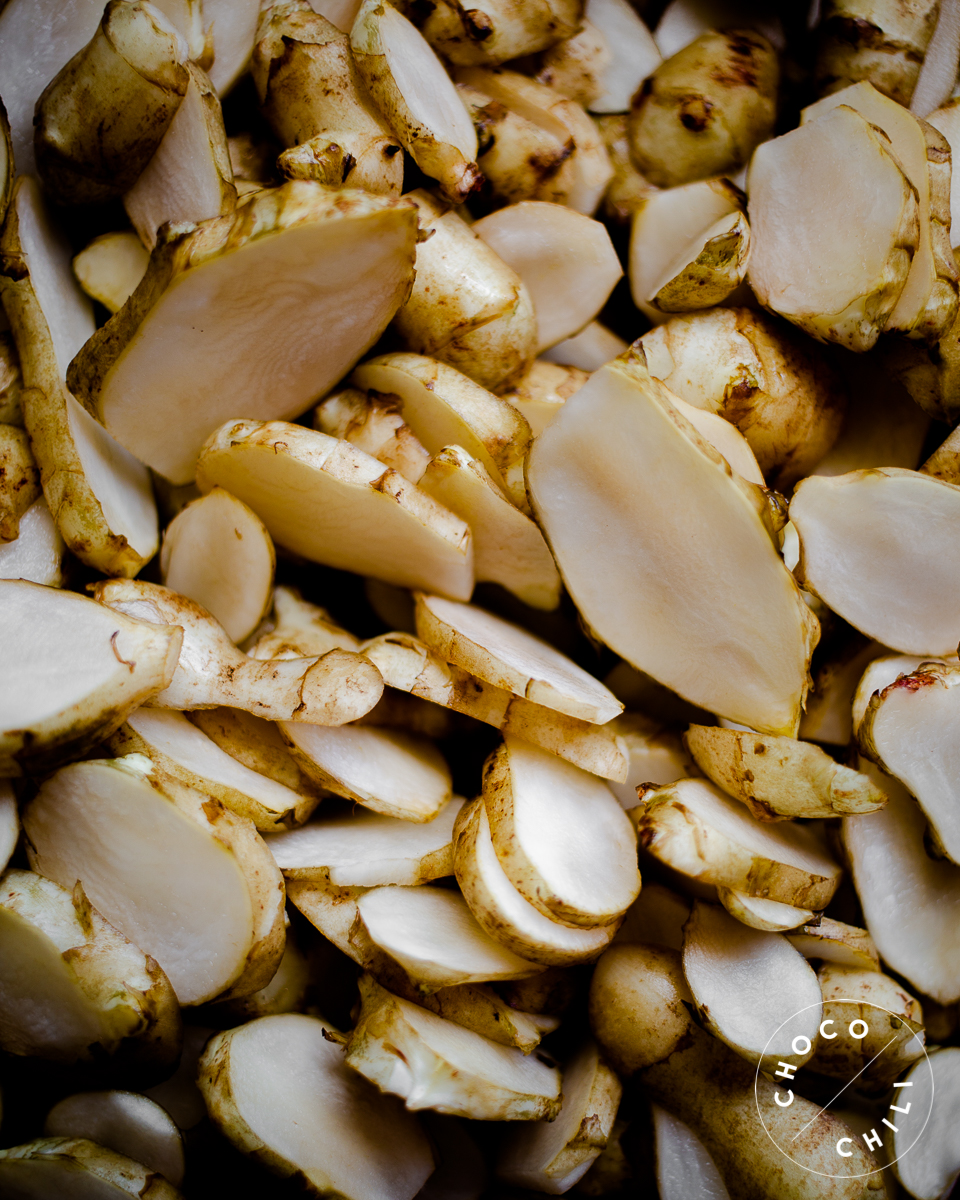 2. Harjaa maa-artisokat puhtaiksi juuresharjalla ja leikkaa ne kuorineen viipaleiksi. Hienonna valkosipulinkynnet.