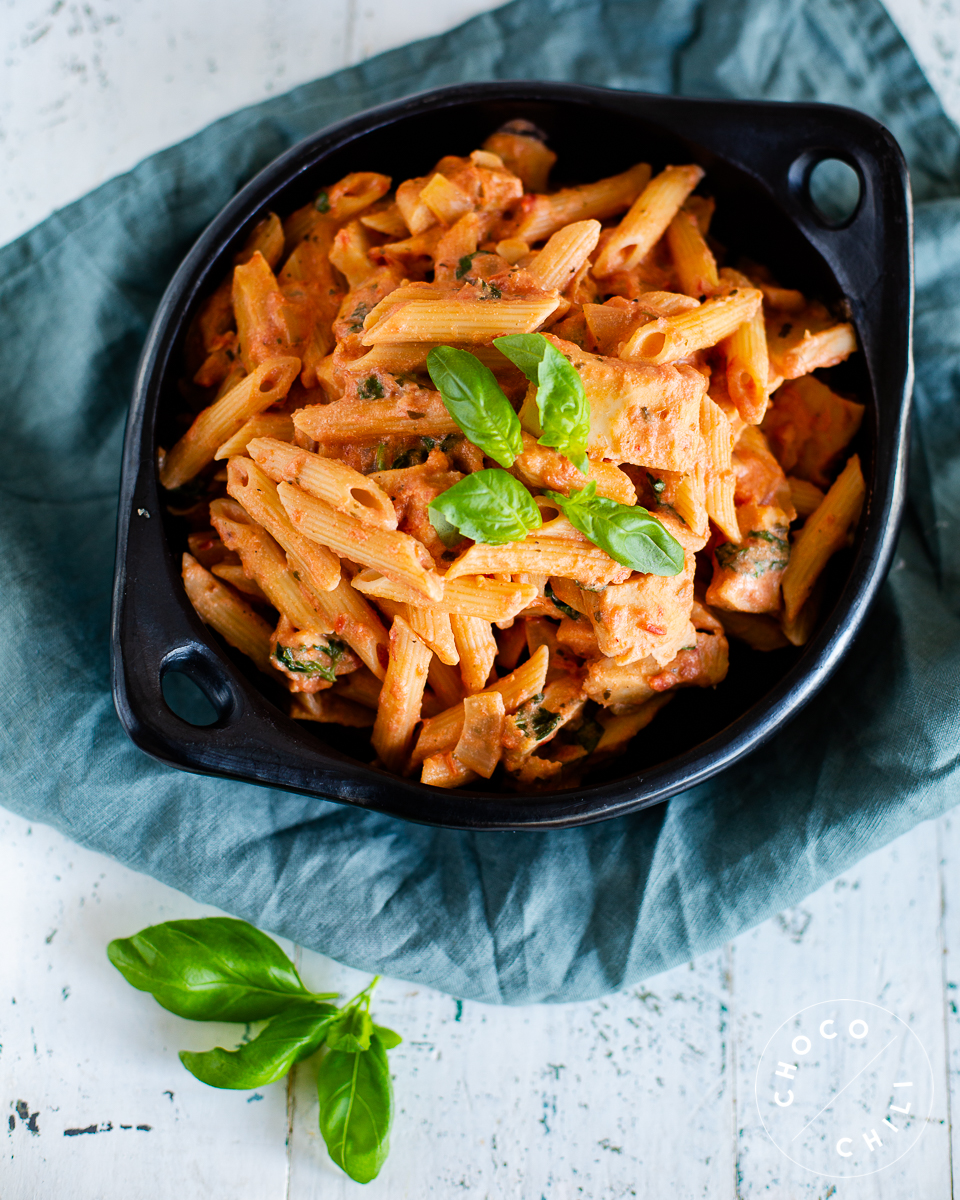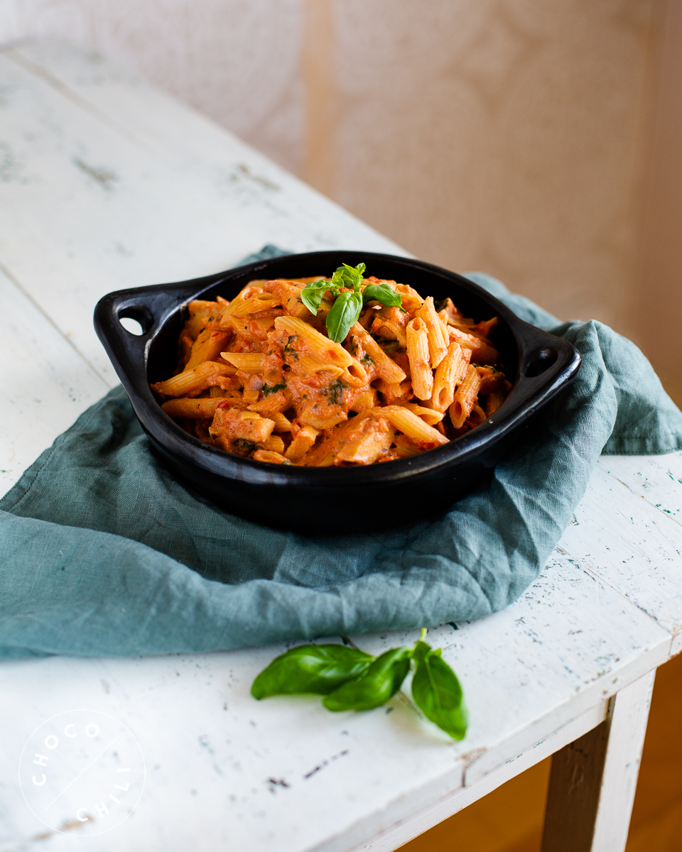 Uudesta keittokirjastani Chocochilin arkiruokaa – 30 minuutin vegaanireseptit löytyy useita hyviä ja helppoja pastaohjeita arkipäivien taklaamiseen. Tässä kuitenkin vielä yksi mainio täyttävä arkipasta, joka saa kylmät syyspäivät tuntumaan vähän paremmilta. Ripottele joukkoon reilusti chiliä, niin tämä pasta myös lämmittää mukavasti!