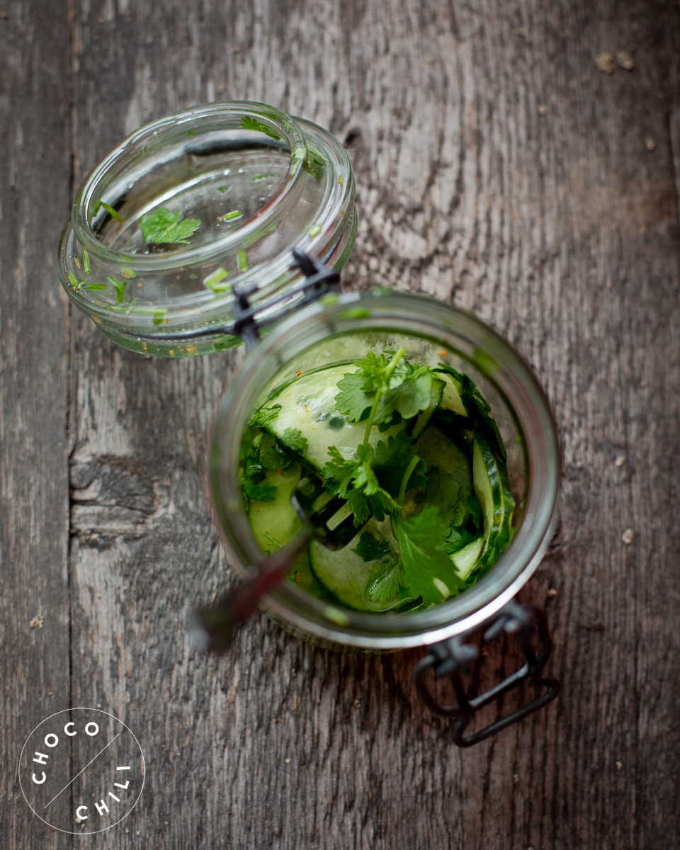 - Valmista ensin kurkut. Viipaloi kurkku esimerkiksi juustohöylällä. Silppua korianteri. Laita kaikki aineet kannelliseen purkkiin ja hölskytä sekaisin.