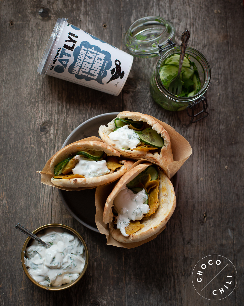Kaupallinen yhteistyö | Oatly – Seitanilla, korianterikurkuilla ja jogurttikastikkeella täytetyt pitaleivät.