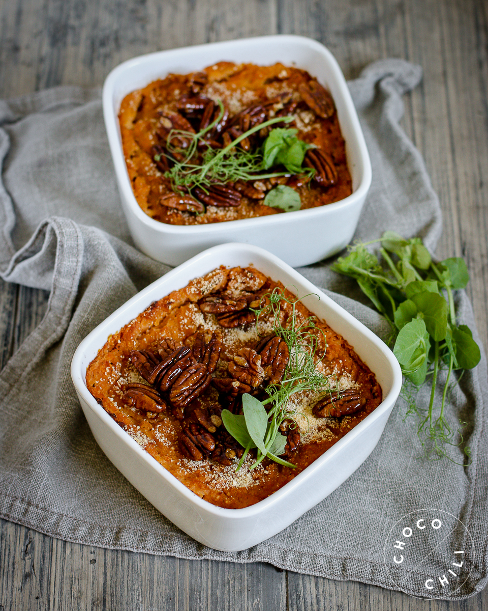 Vegaaninen lanttulaatikko karamellisoiduilla pekaanipähkinöillä
