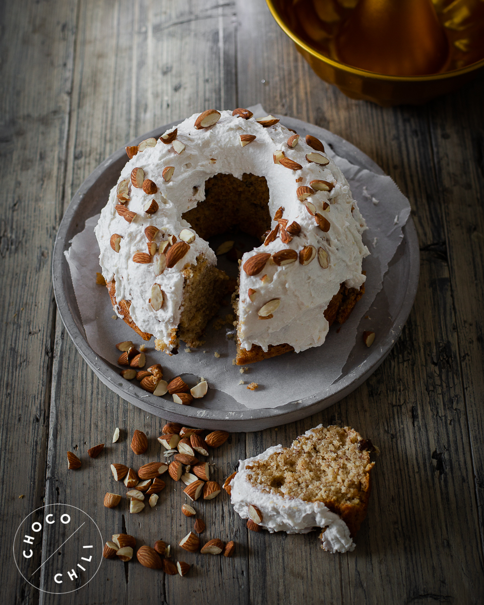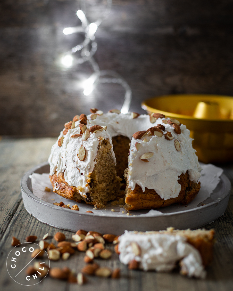 - Anna kakun maustua viileässä seuraavaan päivään. Valmista kuorrute sekoittamalla kaikki aineet yhteen. Levitä kuorrute kakun päälle ja koristele rouhituilla manteleilla.