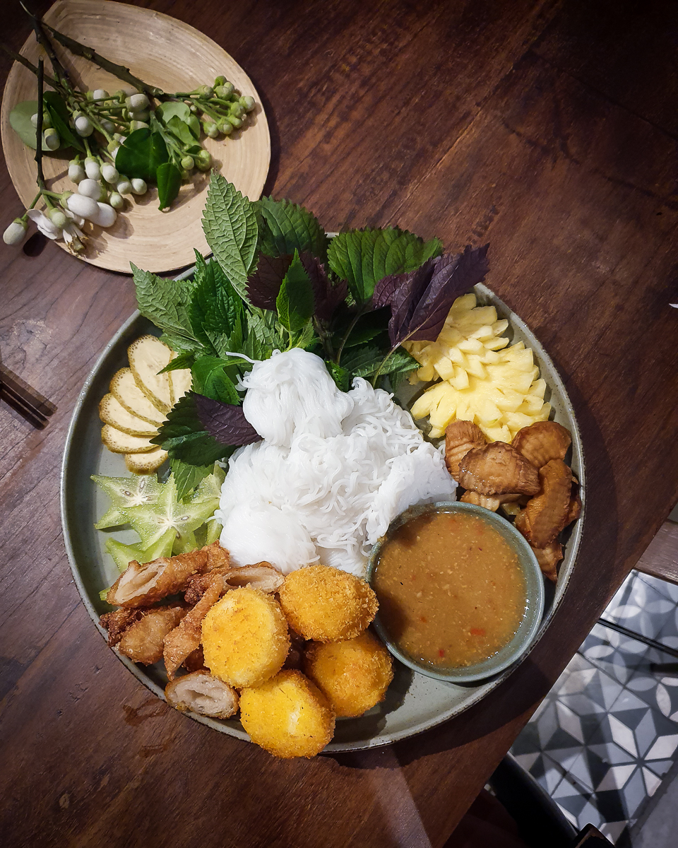Yksi suosikkiravintoloistani Hanoissa oli Ưu Đàm Chay, joka oli fiini ja monia muita ravintoloita kalliimpi, mutta ruoka oli ihan todella hyvää. Kuvan annos koostui friteeratusta tofusta, sienistä, nuudeleista, hedelmistä, erilaisista yrteistä ja ihanasta kastikkeesta. Täydellistä! Tofu on Vietnamissa muuten ihan mielettömän hyvää ja sitä kannattaakin kiskoa kaupungissa kaksin käsin.