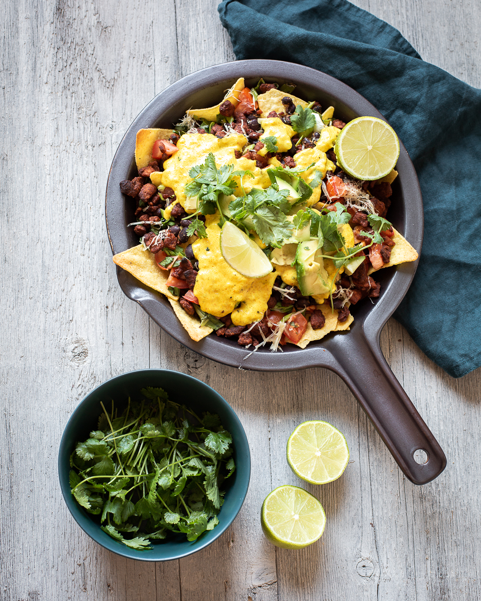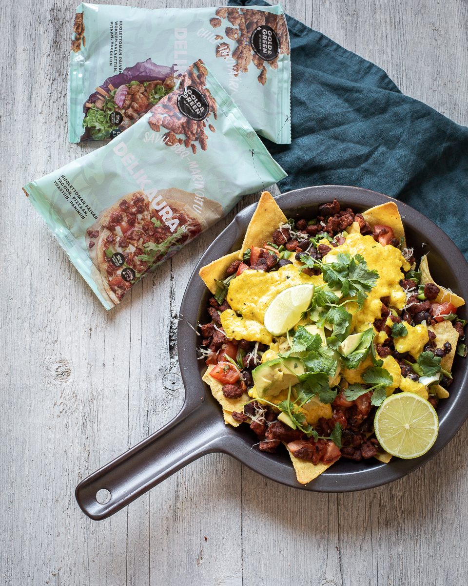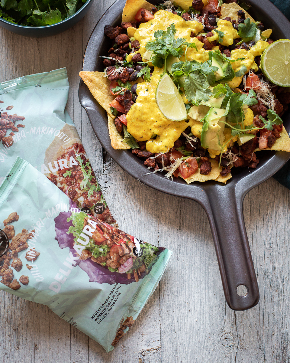 Ihastuin tammikuun Vegemessuilla Gold&Green®-uutuuteen, eli Delikauraan, jota olen käyttänyt moneen ruokaan viime aikoina. Delikaura on valmiiksi maustettu (makuina savu-bbq ja chili-inkivääri) ja sen murumainen, kiinteä rakenne sopii erinomaisesti esimerkiksi salaatteihin, pizzaan, lämpimiin leipiin, wokkeihin ja tähän nachopannuun. Nyhtökaura on ollut käytössä keittiössäni viikottain, mutta tälle uutuustuotteellekin on tilausta! Delikaura on niin hyvin maustettu, että se ei vaadi sen enempää esivalmisteluja ja yhden hengen taloudessa arvostan myös pienempää pakkausta sekä sopivaa hintaa.