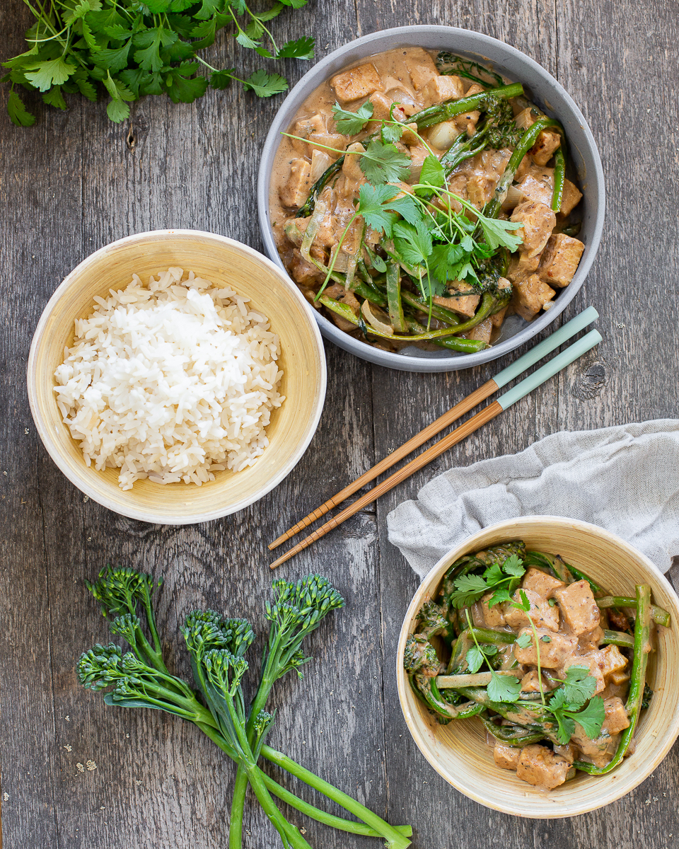 Tämä misoa ja maapähkinävoita sisältävä kookosmaitokastike on yksi suosikeistani. Se on helppo ja nopea valmistaa ja lisukkeita on helppo varioida. Kastikkeeseen sopii tempen tilalle myös tofu ja broccolinit voi vaihtaa esimerkiksi vihreisiin papuihin.