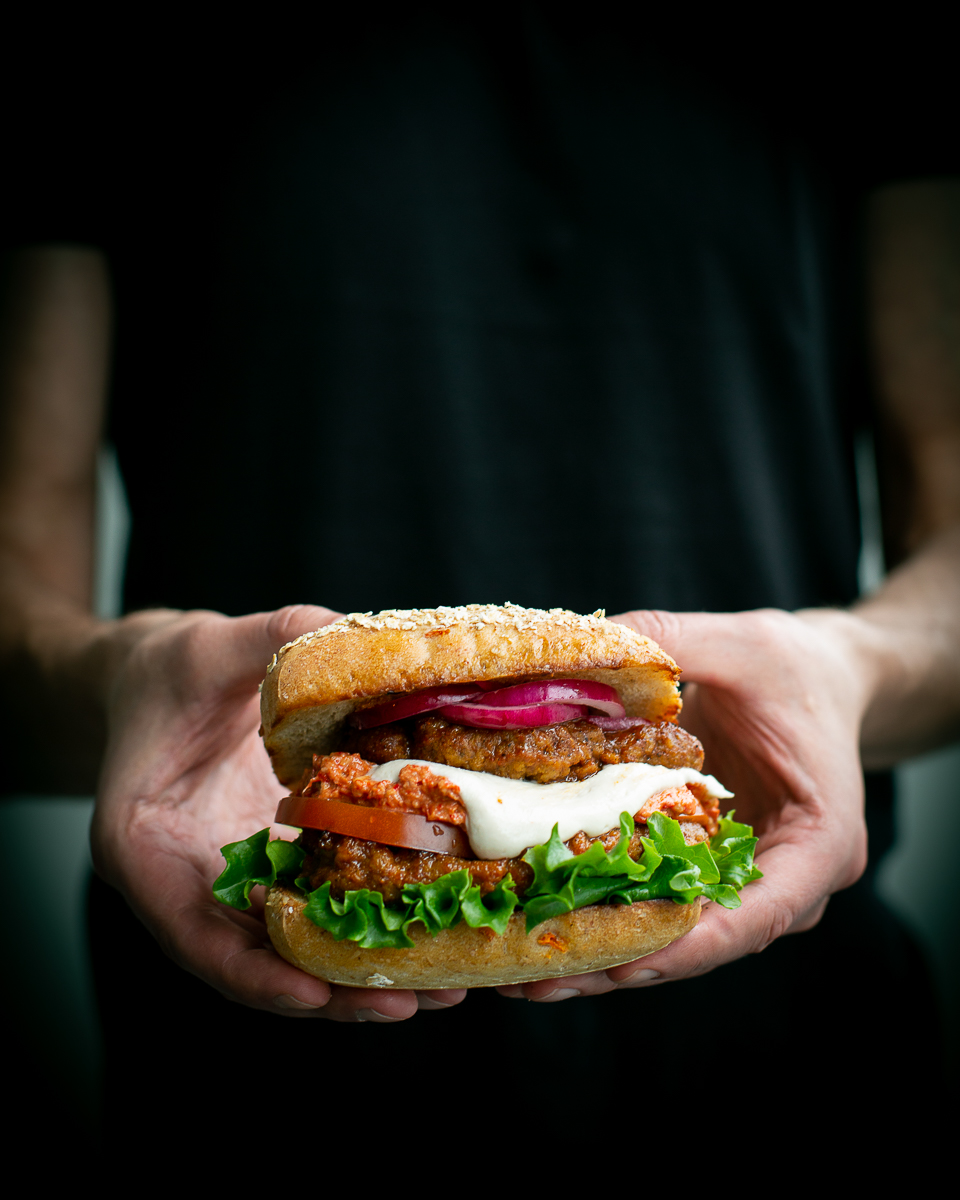 Tuplaseitanburgerit täytetään ras el hanout -maustetuilla seitanpihveillä, muhammaralla ja tahinijogurtilla. Täydellistä pääsiäisruokaa!