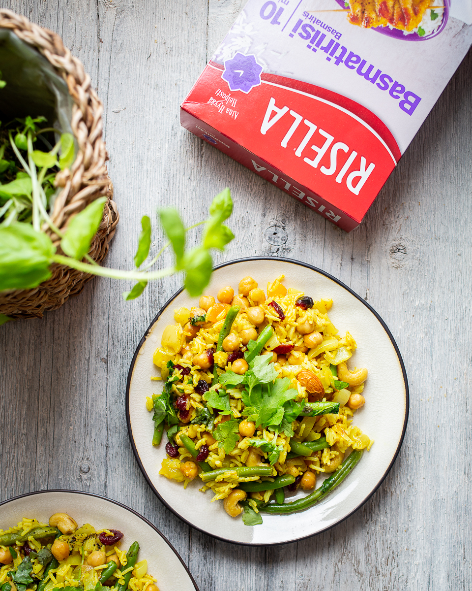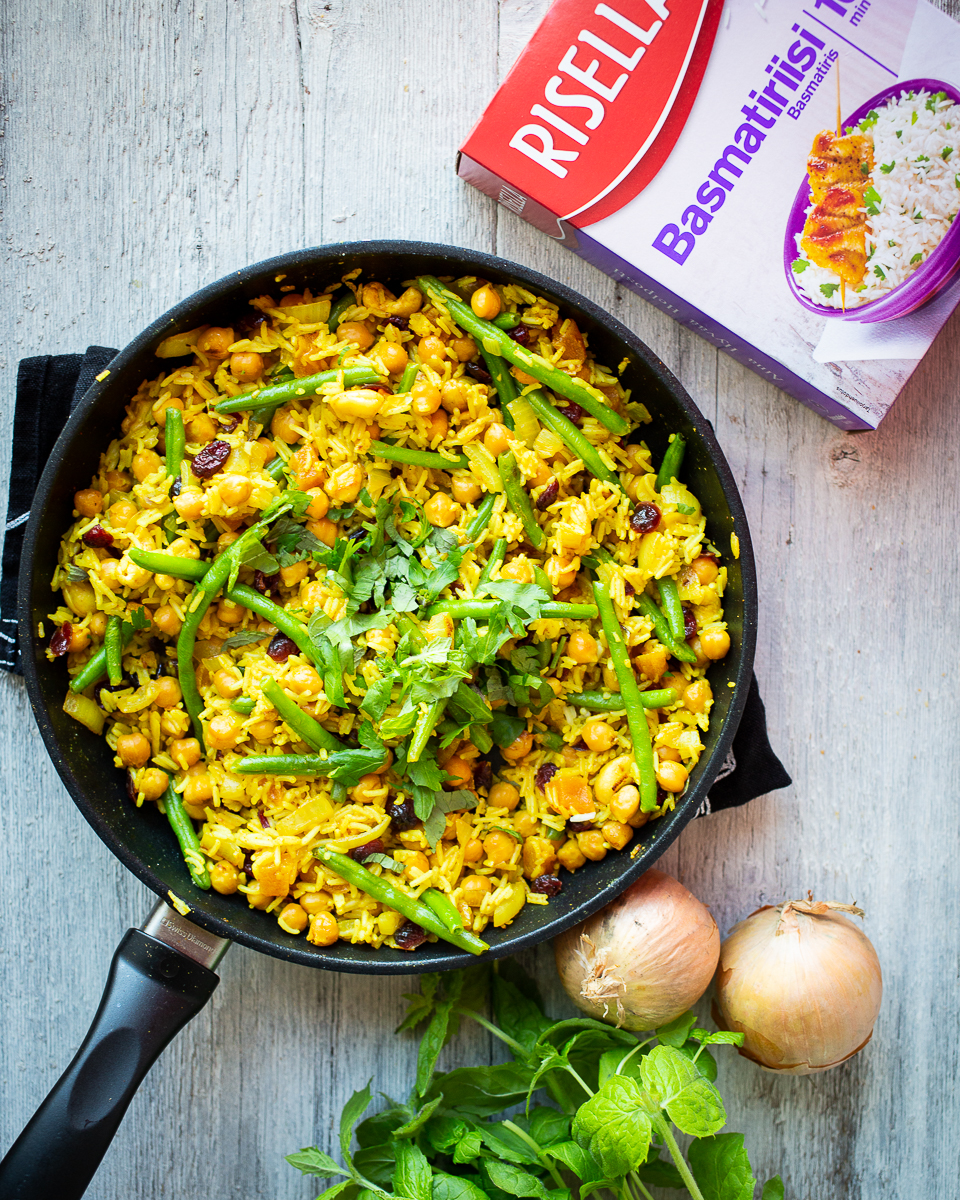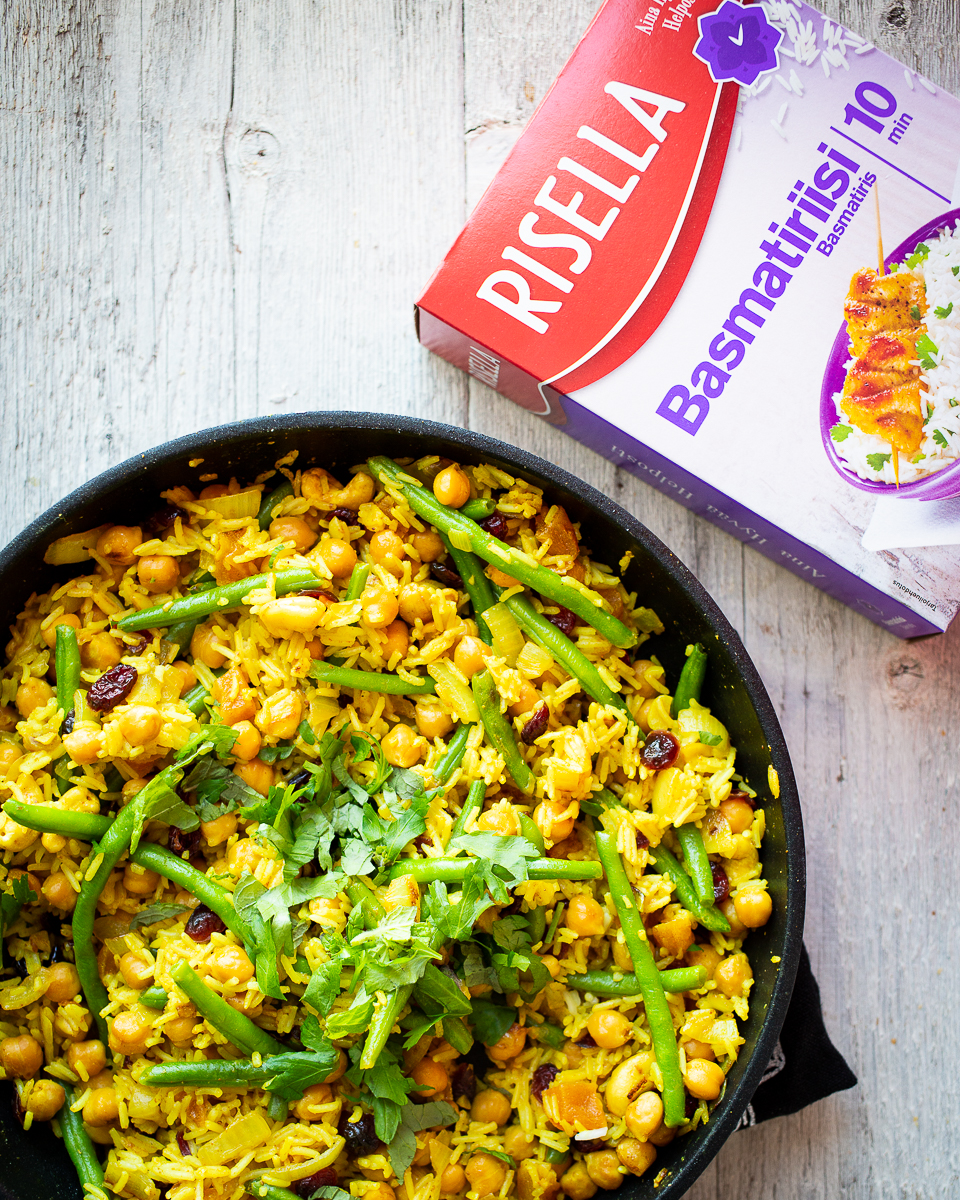 Tämä pilahvi on superhelppo arkiruoka, jonka aineita on helppo varioida sen mukaan, mitä kaapista löytyy. Voit tarvittaessa korvata kikherneet muilla pavuilla, pitkät vihreät pavut herneillä, appelsiinin tilkalla sitruunaa, pähkinät siemenillä ja mausteitakin voi varioida oman maun mukaan. Ja mikä parasta, tämä ruoka on myös todella nopea valmistaa: Risellan basmatiriisi kypsyy 10 minuutissa ja koko ruoan tekemiseen kuluu reilusti alle puoli tuntia.