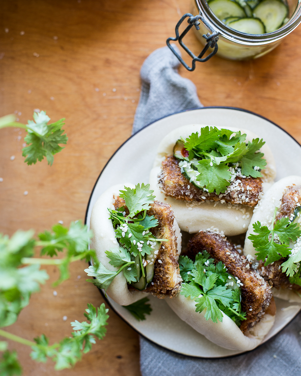 Täytin baot tällä kertaa rapeaksi leivitetyllä tofulla, inkiväärikurkuilla, herkullisella maapähkinäkastikeella, korianterilla ja tujauksella Srirachaa. Tofujen leivitystaikinan maustoin kiinalaisella viismausteella, mutta voit halutessasi korvata sen esimerkiksi sipuli- ja valkosipulijauheilla.
