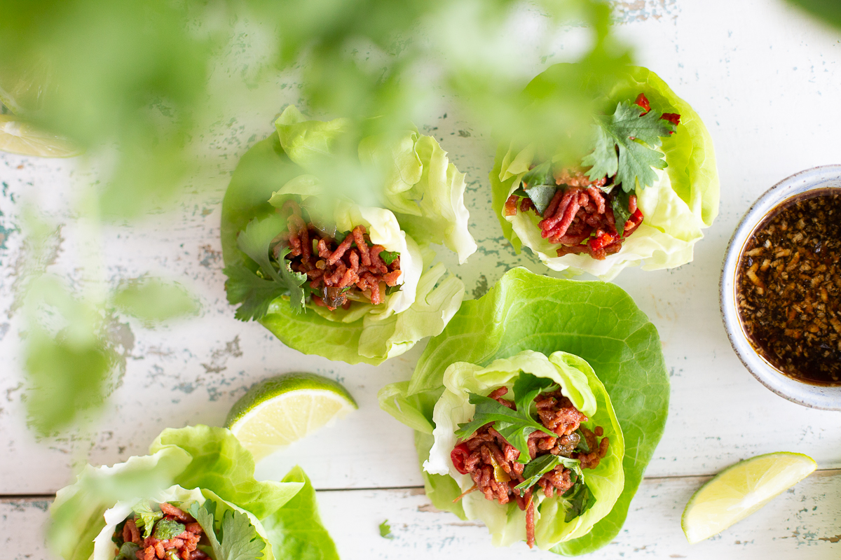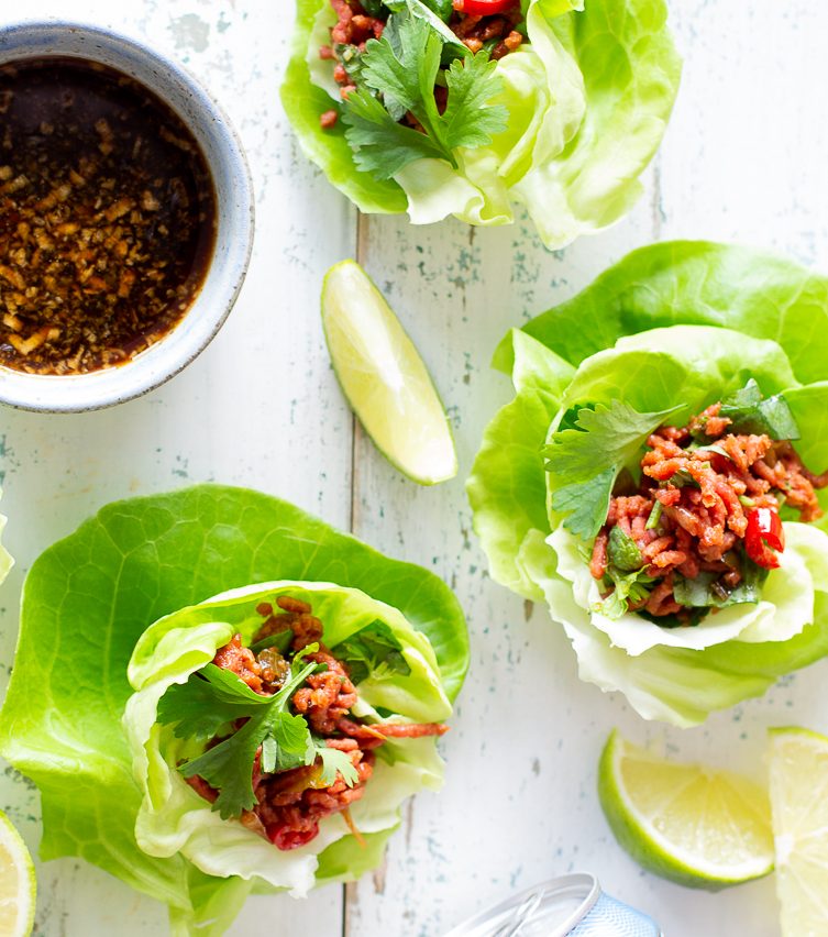 Laab (tai larb) on Laosista kotoisin oleva ruokalaji, joka valmistetaan jauhelihasta ja vähän alueesta riippuen maustetaan muun muassa tuoreilla yrteillä ja limellä. Vegaaniversio valmistuu mistä tahansa ”vegelihasta”, kuten vegejauhiksesta (esim. Pouttu Muu tai Pirkka), nyhtökaurasta tai Beanit-murusta ja kalakastikkeen sijaan kastikepohja valmistuu sieni- ja soijakastikkeesta. Kuoren tyyliin salaattikipoista tarjoiltu laab on ihan täydellistä kesäruokaa, jonka voi helposti ottaa mukaan vaikka piknikille. Pakkaa laab mukaan kannelliseen astiaan ja täytä salaatinlehdet paikan päällä.