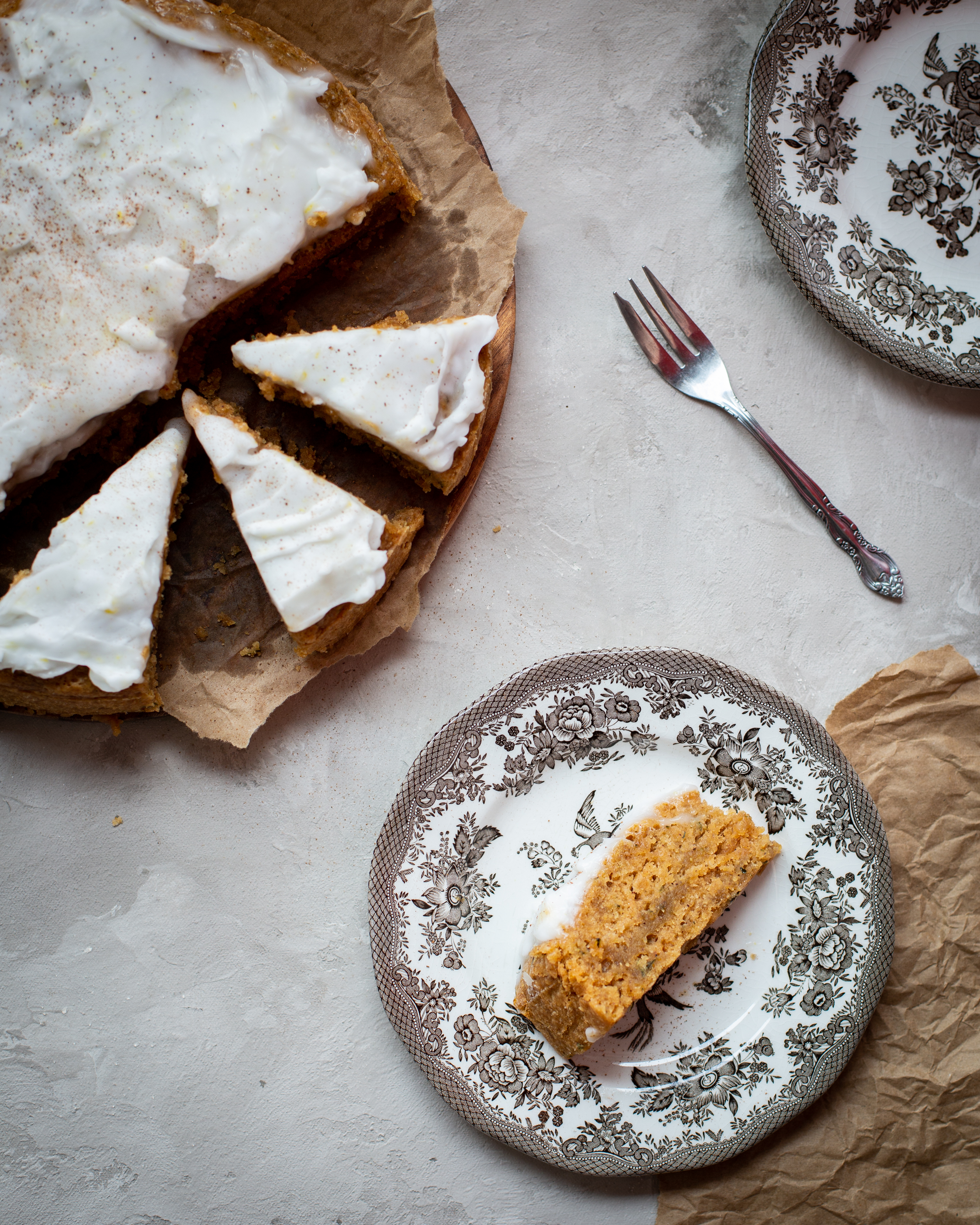 Kakku on tehty tämän porkkanakakun ohjeen pohjalta. Tämä toimi oikein mainiosti myös gluteenittomana versiona. Laitoin kakkuun vähän eri mausteet ja tästä tuli ihanan mehevä ja mausteinen syksyinen kakku.