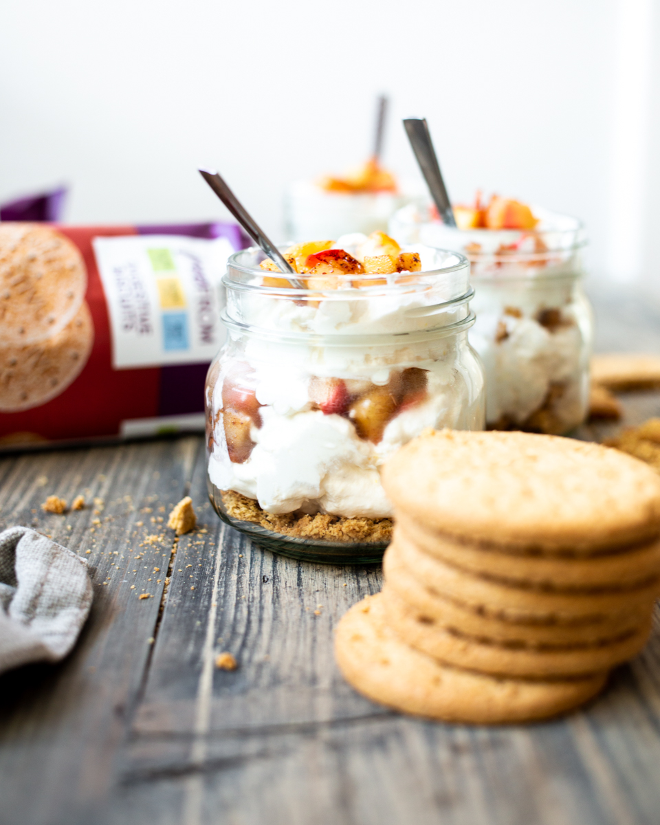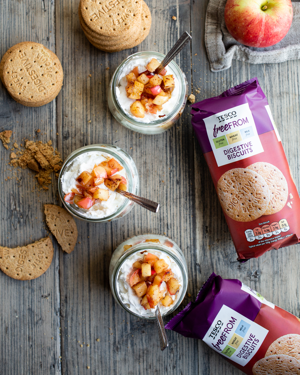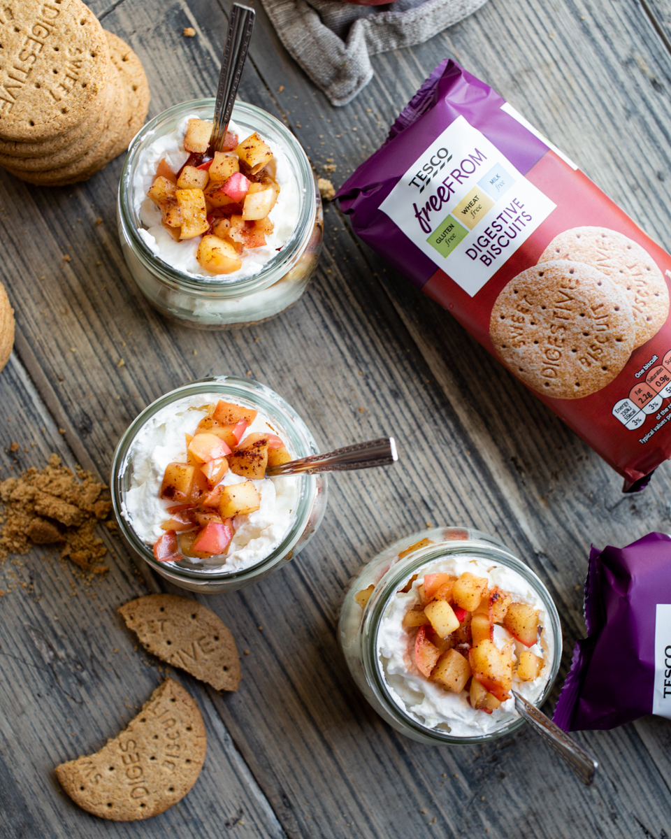 Nämä juustokakkupurkit maistuvat syksyyn sopivasti kanelilta ja omenoilta. S-ryhmän kaupoista löytyvät Tescon Free From -sarjan vegaanisista digestive-kekseistä syntyy juustokakuille rapea (ja gluteeniton!) pohja. Nämä juustokakkupurkit ovat siis täydellinen yhdistelmä rapeaa keksiä, suussasulavaa juustokakkuvaahtoa ja makeita omenoita.