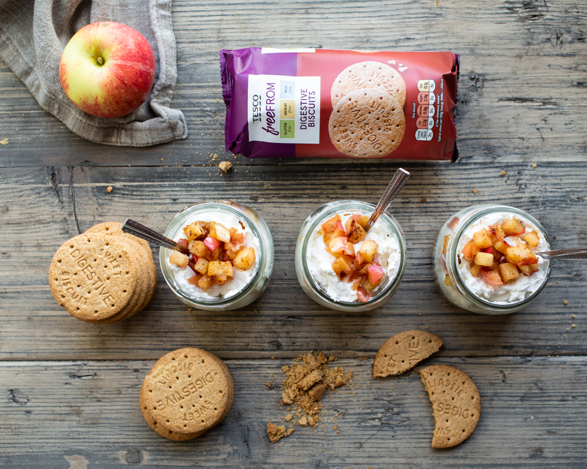 - Murustele keksit (voit jättää joukkoon muutamia isompia sattumia) purkkien pohjalle. Lusikoi päälle vuorotellen juustokakkuvaahtoa ja omenapaloja.