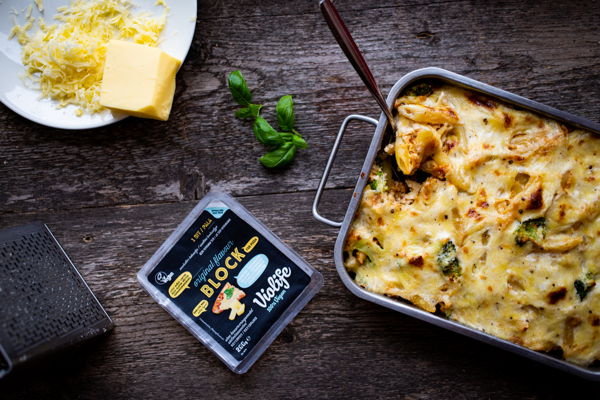 - Sekoita uunivuoassa yhteen keitetty pasta, parsakaalit, tofutäyte ja 50 g Violife-raastetta. Levitä uunivuoan pinnalle juustokuorrute ja paista uunissa noin 20 minuuttia. Siirrä vuoka tarvittaessa hetkeksi grillivastuksen alle, niin saat siihen kauniin ruskistuneen pinnan.