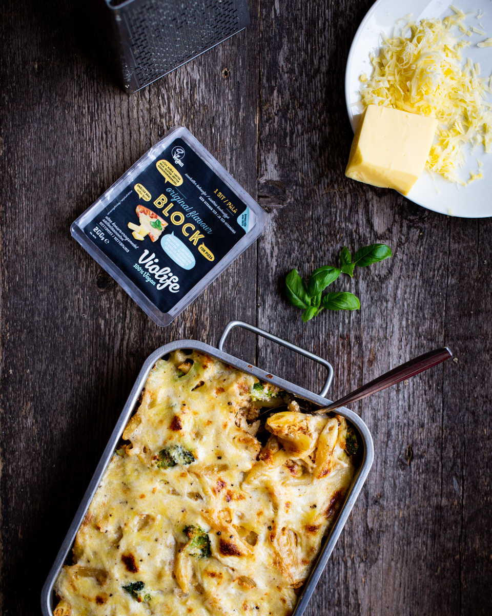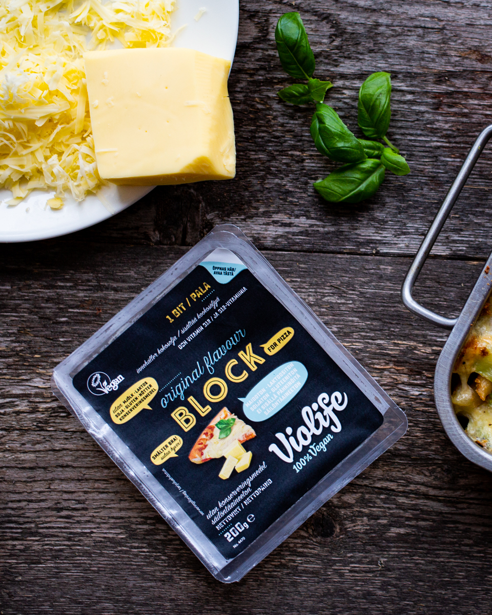 Vegaanisen juustokuorrutteen tekeminen on helppoa: raasta Violifen Original Block -vegejuusto ja sekoita se kaurakermaan ja lisää vähän mausteita. Kuorrute sulaa uunissa täydellisesti ja mehevöittää tämänkin pastaruoan. Violifen vegejuustot sulavat myös sellaisenaan, mutta minusta vielä herkullisempi kuorrute tulee, kun vegejuuston sekoittaa kaurakermaan.