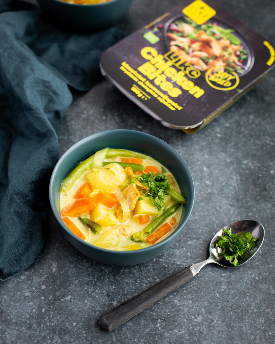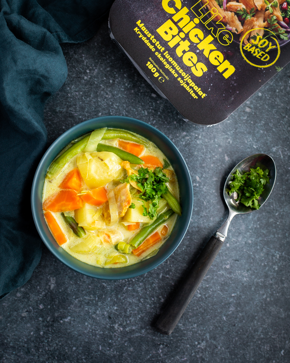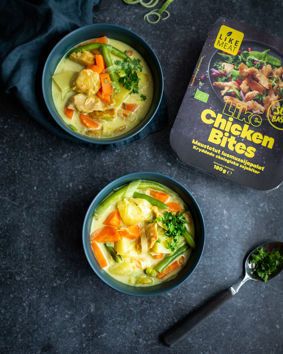 LikeMeatin Chicken Bites muistuttaa sekä tekstuuriltaan että maultaan hyvin paljon kanaa. Tuote on ihan loistava mihin tahansa kanaruokiin ja toimii erinomaisesti myös tässä keitossa. Soijapalojen koostumus pysyy hyvänä ja mehevänä, vaikka keittoa säilyttelisi muutaman päivän ja lämmittäisi uudelleen.