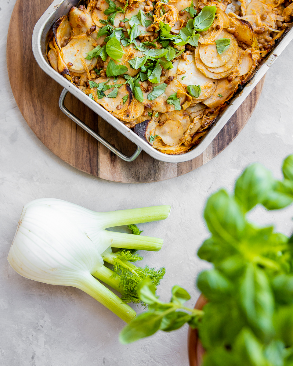 Pääsiäinen on jo ihan nurkan takana! Vaikka tänäkin vuonna pääsiäistä on vietettävä kotioloissa lähipiirin kesken, voi silti sentään syödä hyvin. Tämä ihana harissalla maustettu fenkoli-perunavuoka sopii ihan loistavasti pääsiäispöytään. Se sopii mahtavasti esimerkiksi kasvispyöryköiden, appelsiiniglaseeratun tofukinkun tai seitanpihvien kanssa.