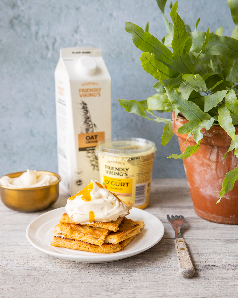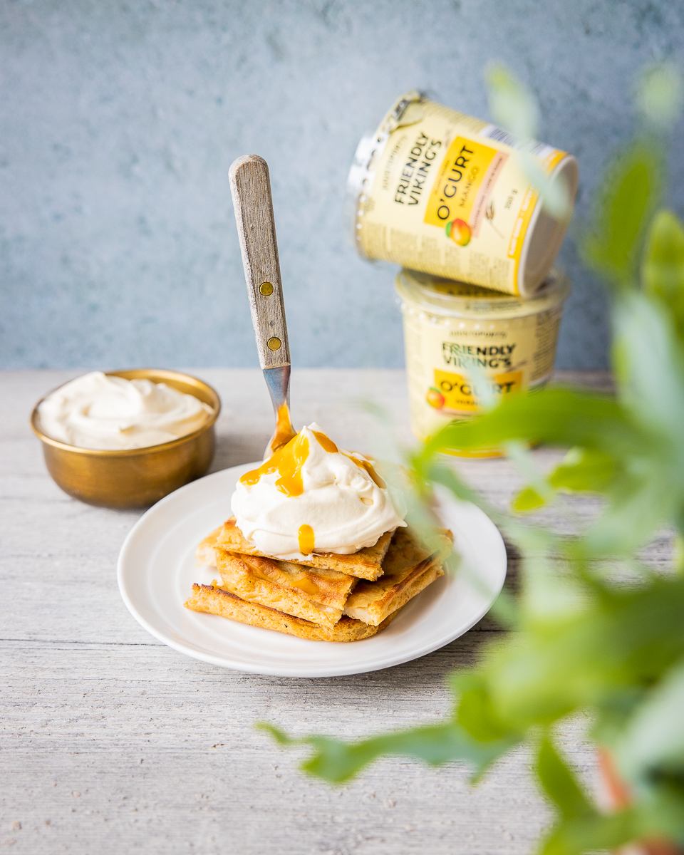 O’gurtit toimivat loistavasti sellaisenaan välipaloina tai esimerkiksi marjojen ja myslin kanssa, mutta ne sopivat myös leivontaan ja erilaisiin jälkkäreihin. Mango O’gurtin maku sopii erinomaisesti myös tämän pannukakkujen kanssa tarjoiltavan jälkkärivaahdon maustamiseen.