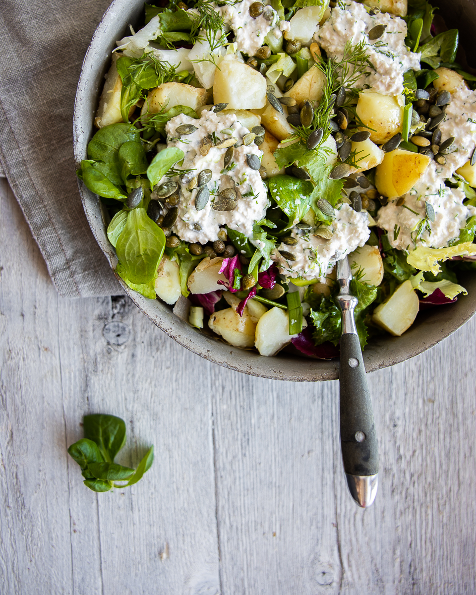 Tämä salaatti on saanut inspiraationsa helsinkiläisen Harju8-ravintolan listalla aikaisemmin olleesta tofuskagensalaatista. Salaatissa oli lisäksi uuden sadon miniporkkanoita ja marinoitua punasipulia, joten niitäkin voi kaikin mokomin lisätä joukkoon jos siltä tuntuu.