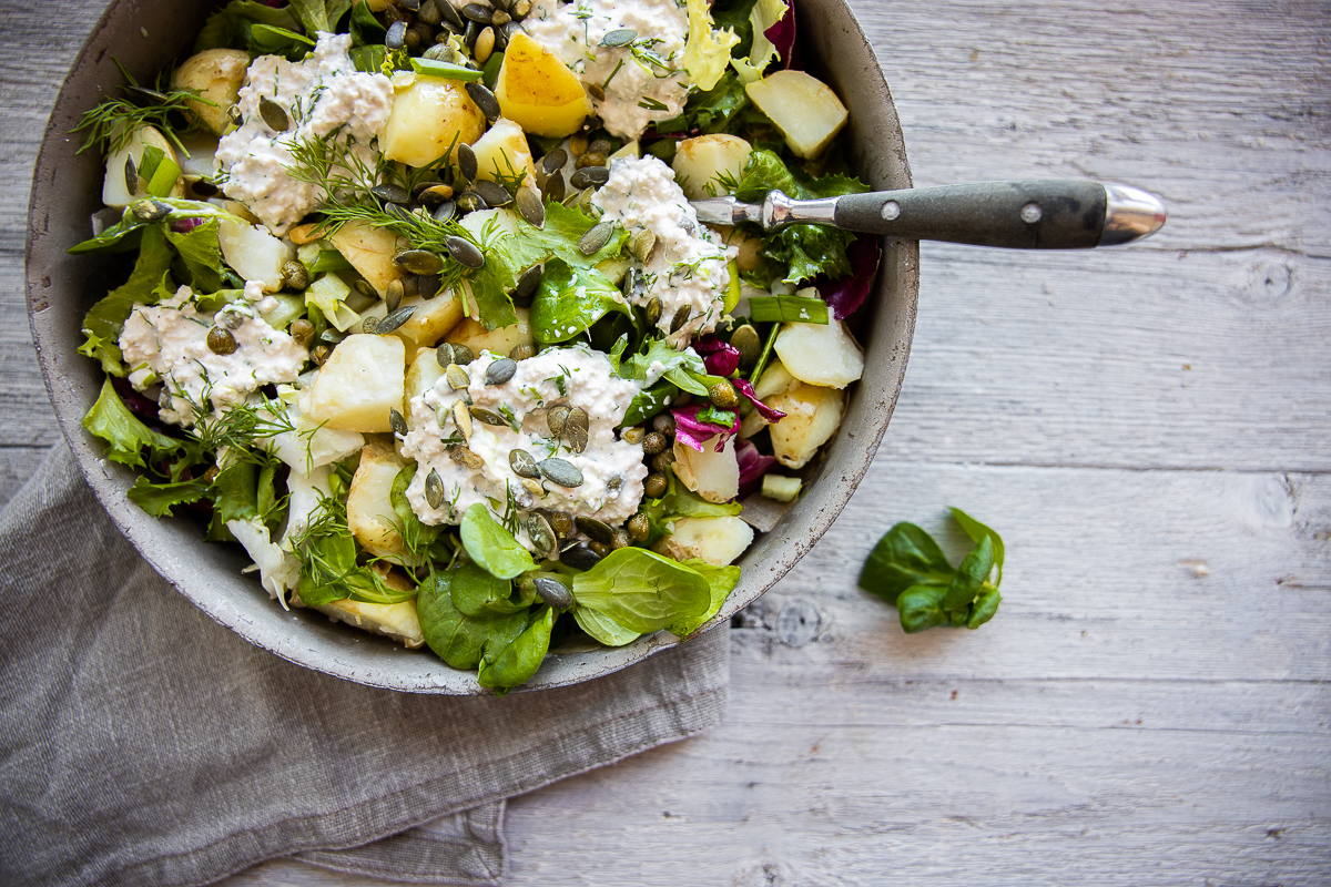 Raikas ja täyttävä perunasalaatti vaikkapa vappupiknikille.