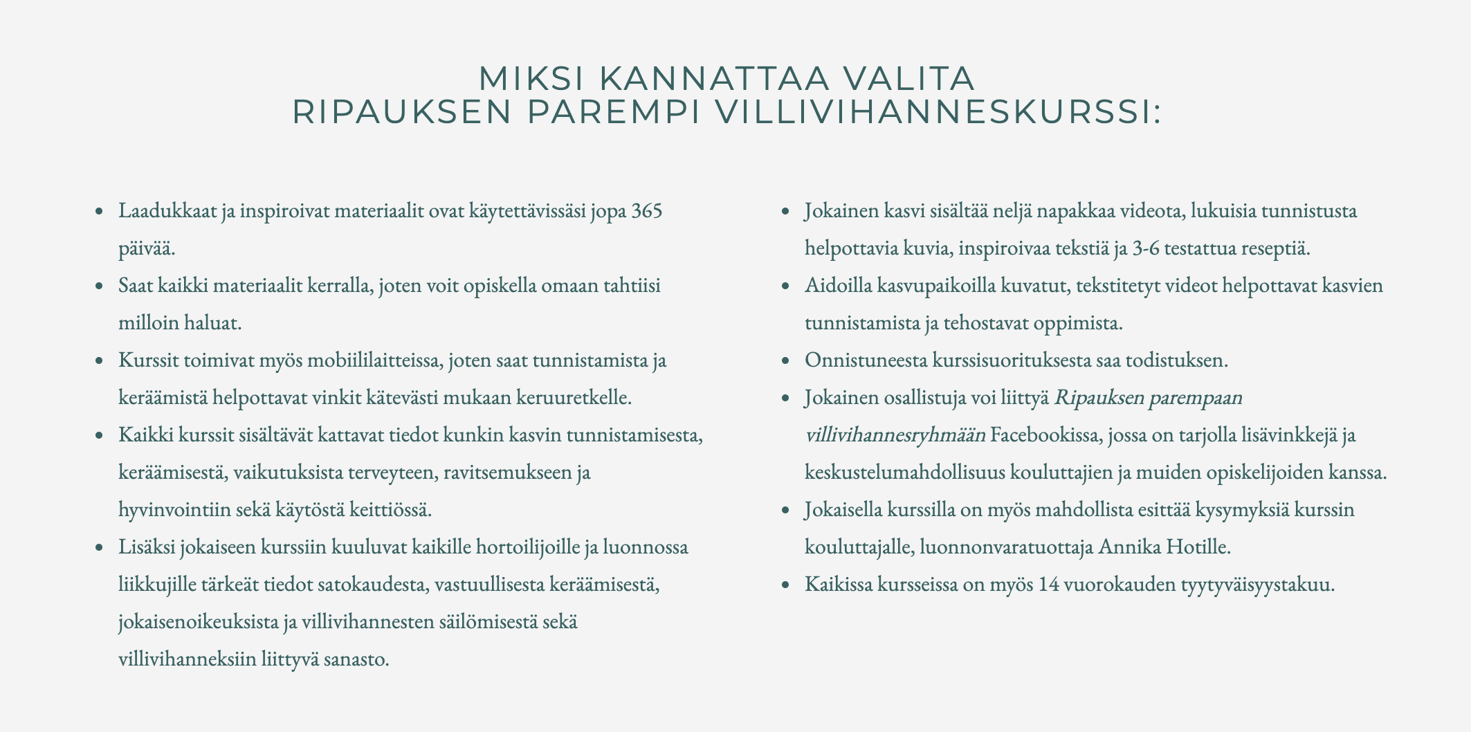 Olen opiskellut omatoimisesti Ripauksen villivihanneskurssin laajaa oppimäärää, joka on kattava opas villivihannesten tunnistamiseen, keräämiseen ja käyttöön. Ripauksen kurssilta löydät tarkat tunnistusohjeet yleisimmistä villivihanneksista ja mikä parasta (vegaanisia) reseptejä niiden käyttämiseen! Kurssilla on lyhyt videoesittely jokaisesta aiheesta, sekä runsaasti kuvamateriaalia tunnistusta helpottamaan.