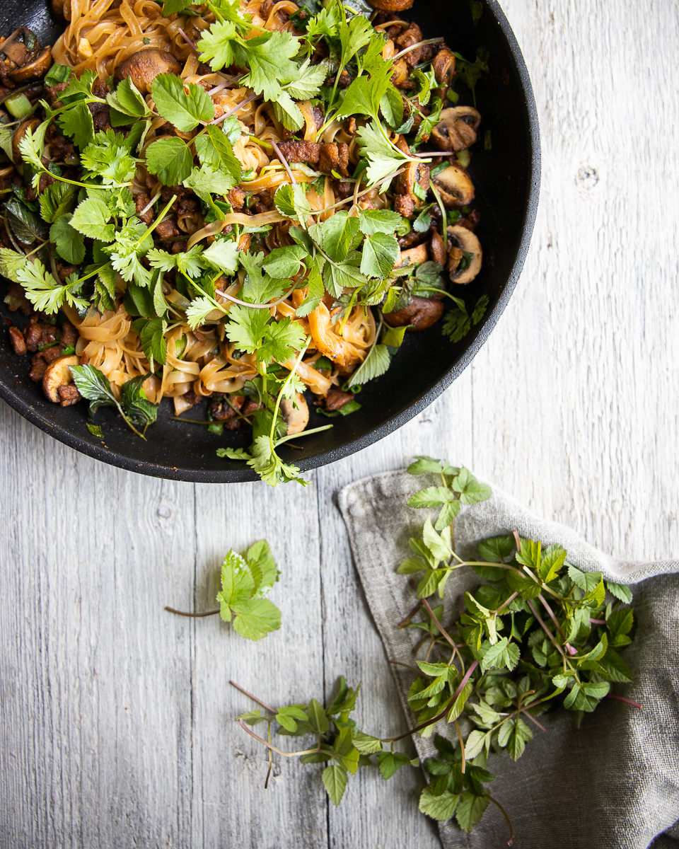 4. Lisää lopuksi pannulle valmiit nuudelit, loput kastikkeesta sekä kevätsipulit. Lisää vuohenputki ja korianteri nuudeleiden joukkoon viimeisenä.