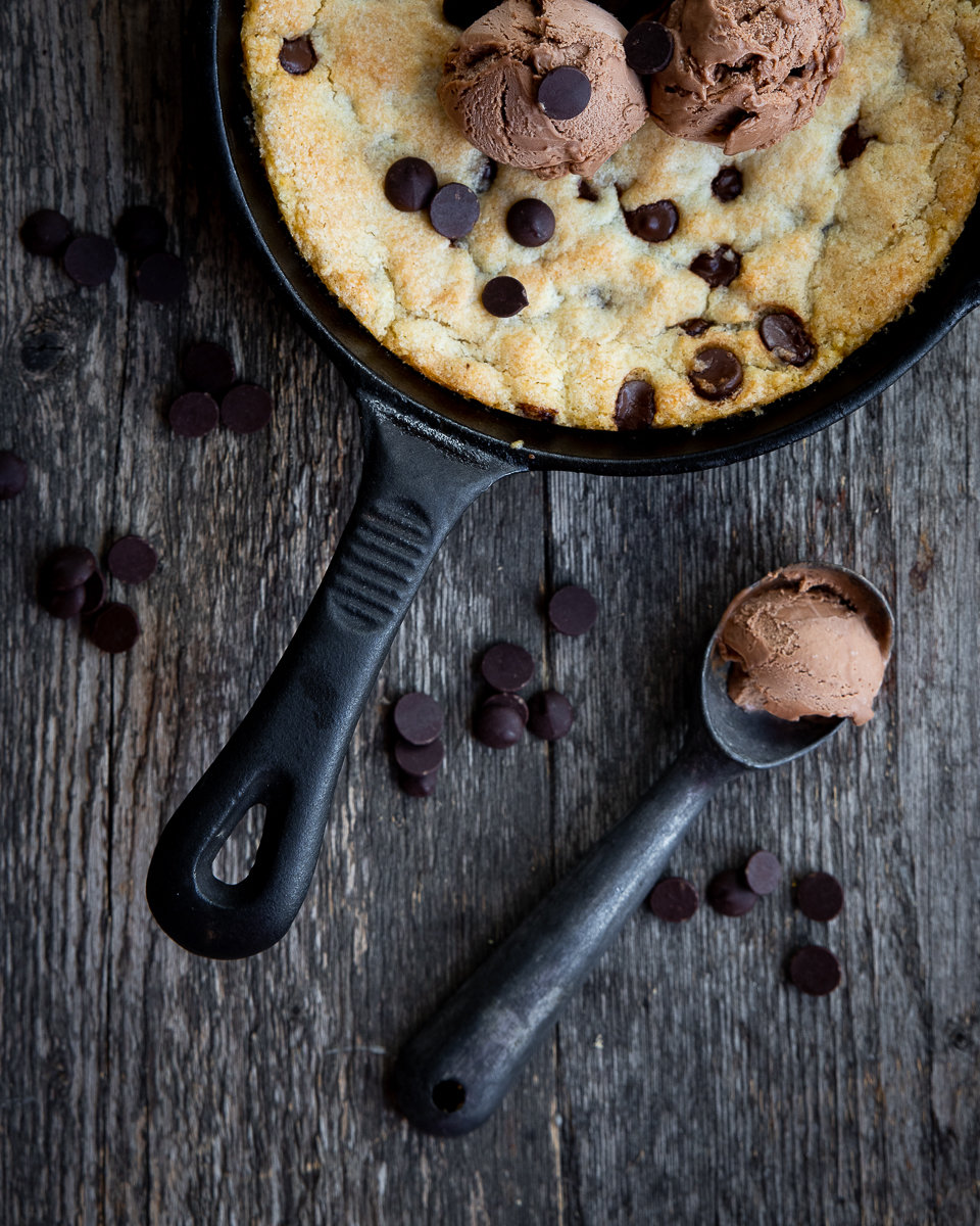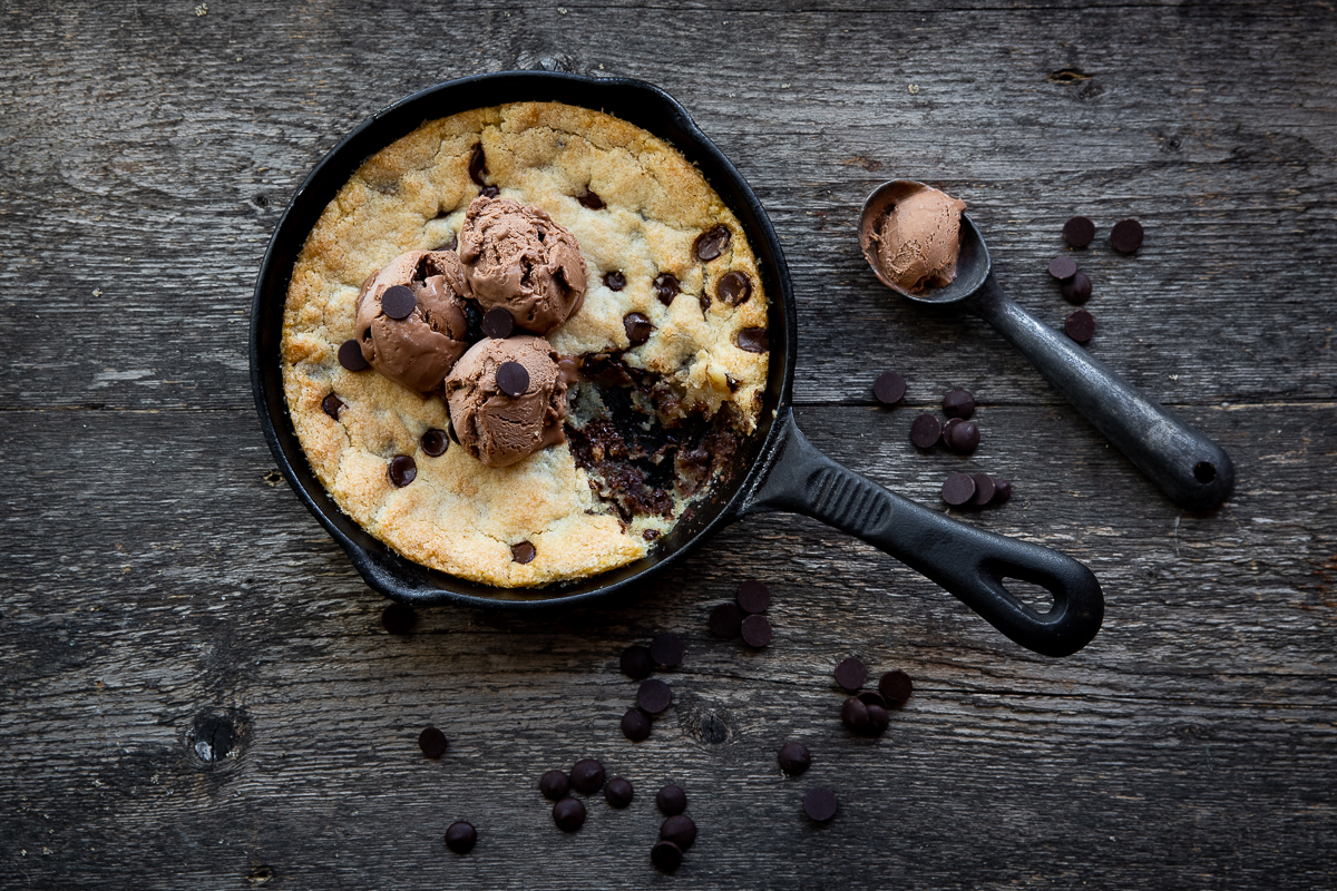 Tämä pinnalta rapea ja sisältä tahmea pannukeksi on ihanan överi! Supermakea keksin sisälle on sulanut tahmeaa suklaata ja koko herkun kruunaa kylmä jäätelö.