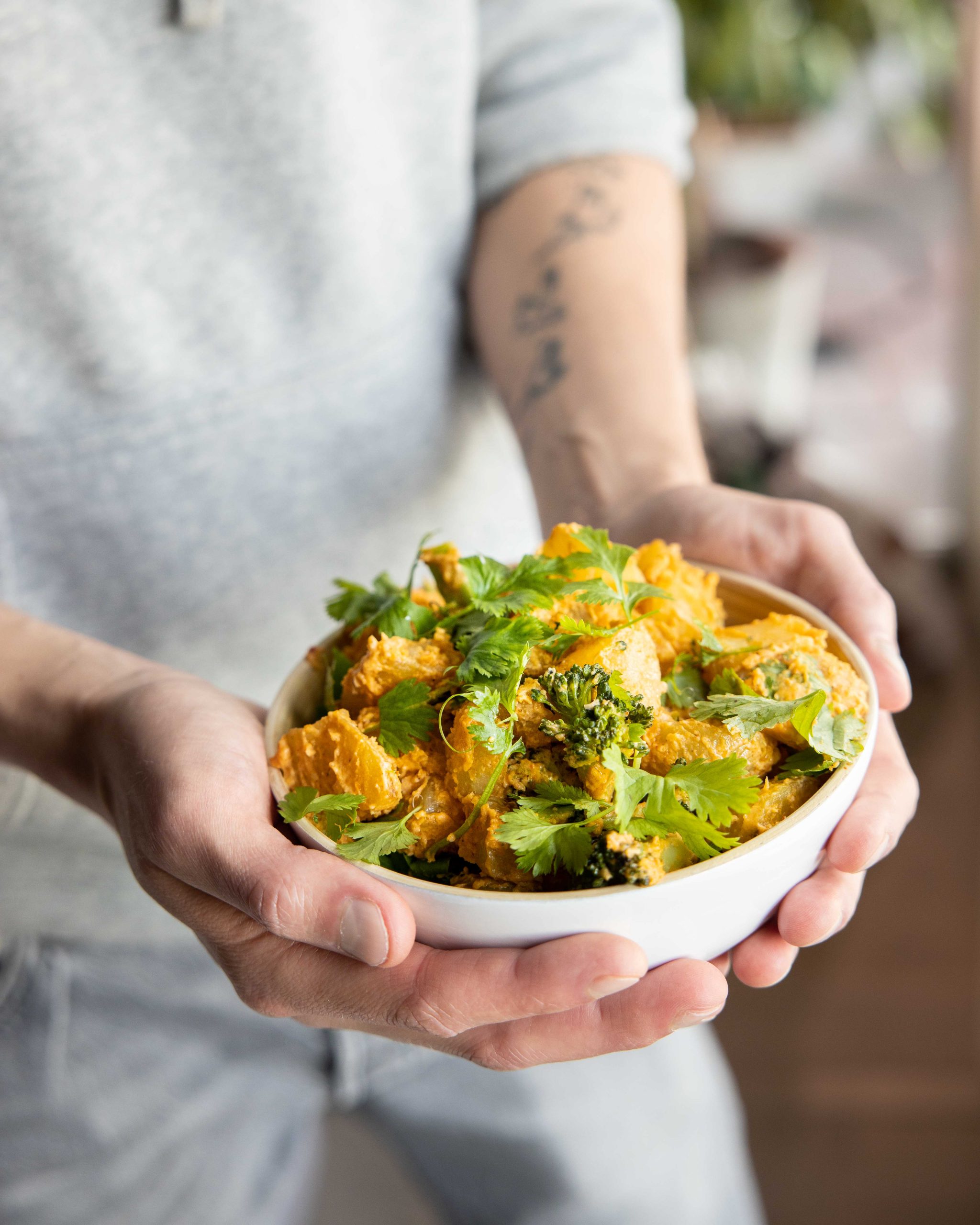 - Sekoita hummuksen joukkoon harissa, sitruunan kuori ja mehu sekä oliiviöljy. Laita paahdetut kasvikset kulhoon ja sekoita joukkoon silputtu kevätsipuli sekä hummus. Lisää sekaan lopuksi tuore korianteri.