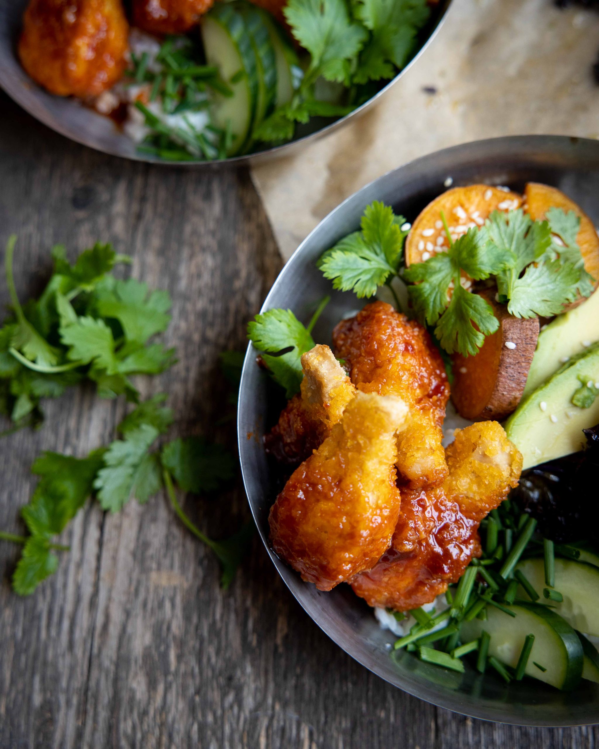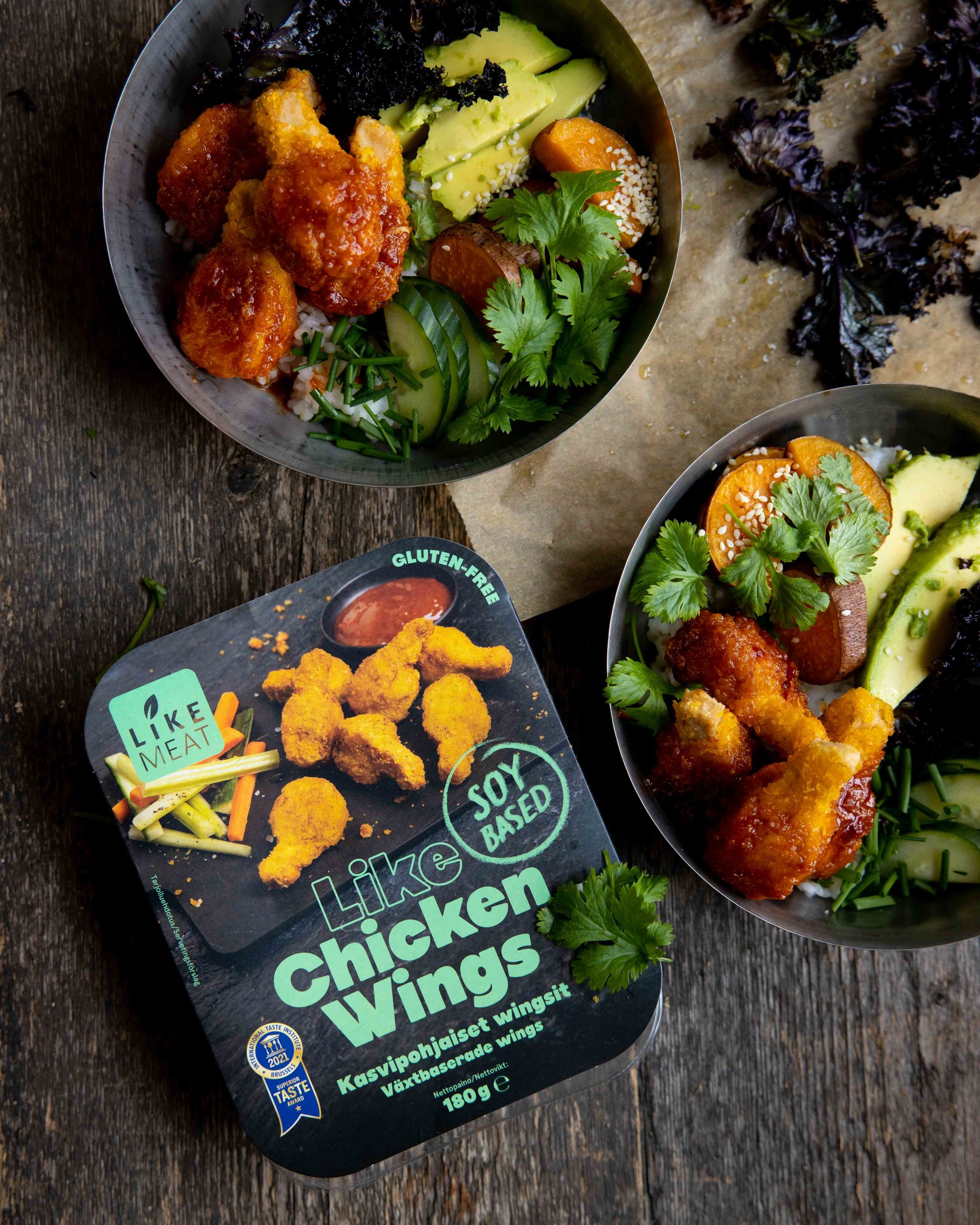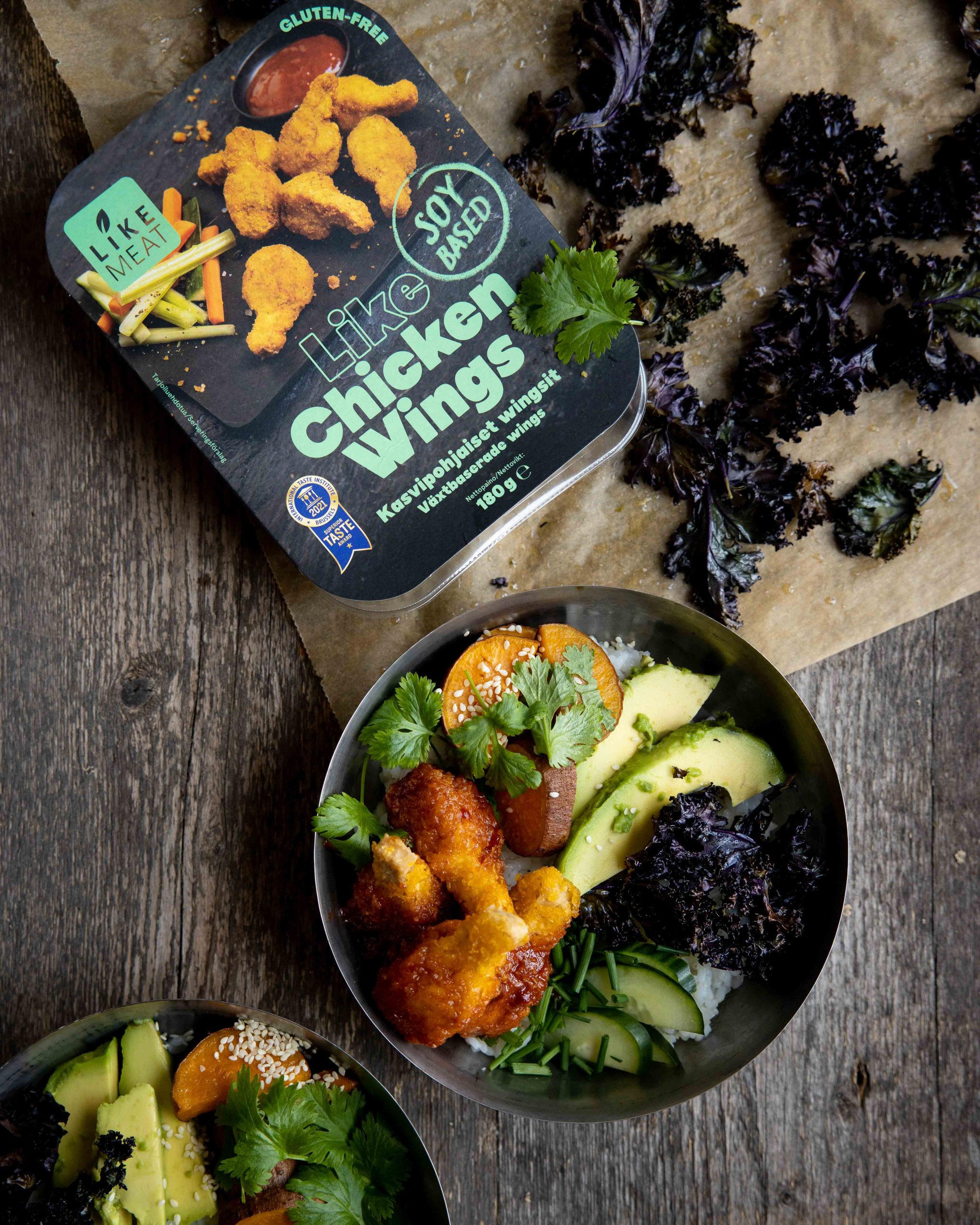 Tämän ruoan herkullisinta osastoa näyttelee LikeMeatin uudet vegaaniset wingsit! Ne valmistuu helposti uunissa tai vaihtoehtoisesti pannulla, jos haluat vielä rapsakamman lopputuloksen. Nämä soijapohjaiset wingsit maistuvat erilaisten dippien kanssa ja sopivat ihan täydellisesti myös tällaisiin kulhoruokiin. Tykkään tosi paljon näiden kanamaisesta koostumuksesta ja mausta! LikeMeatin valikoimissa on monia muitakin superhyviä tuotteita, joista olen aikaisemmin tehnyt mm. kanatonta keittoa ja vegegyrosta. Tuotteita löytyy K- ja S-kauppojen valikoimista.