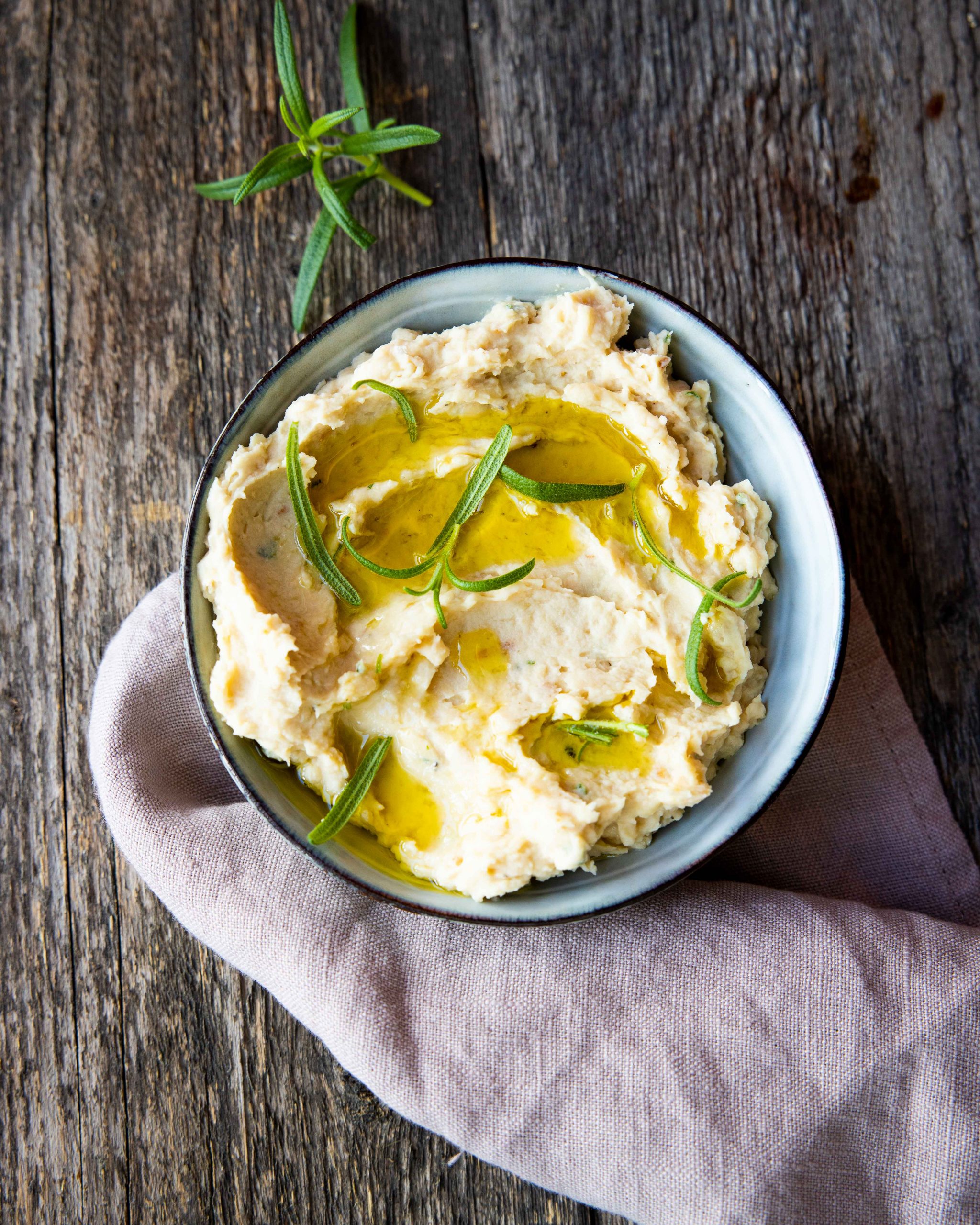 3. Lusikoi tahna kulhoon ja valuta pinnalle oliiviöljyä. Koristele rosmariinilla.