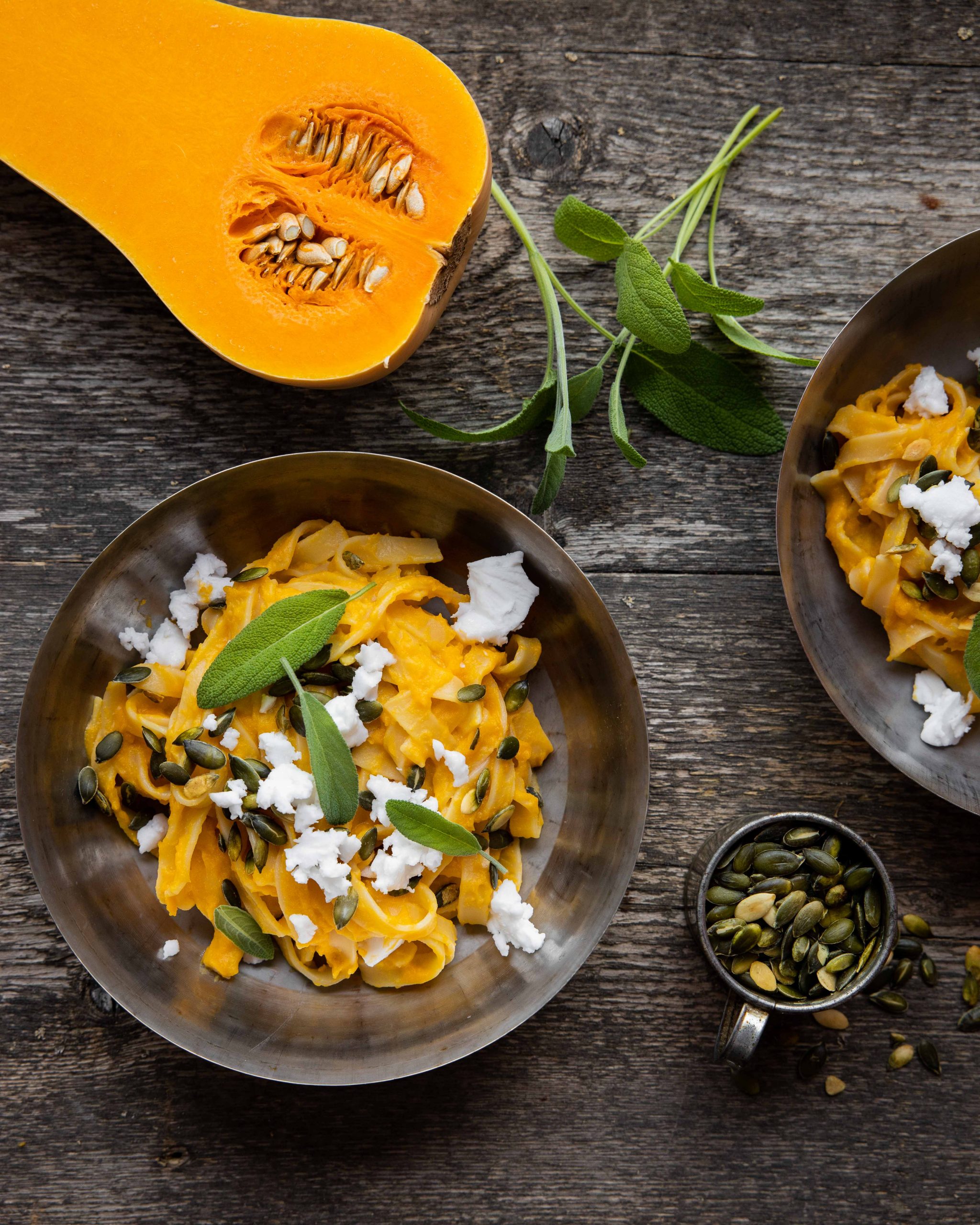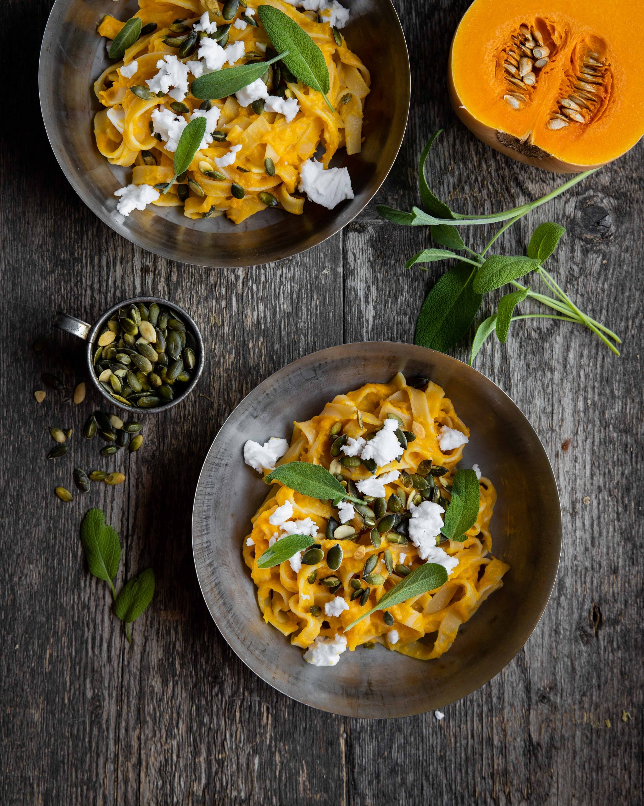 - Sekoita kurpitsasose pastan joukkoon. Ripottele päälle kurpitsansiemeniä ja murennettua fetaa. Viimeistele tuoreella salvialla.
