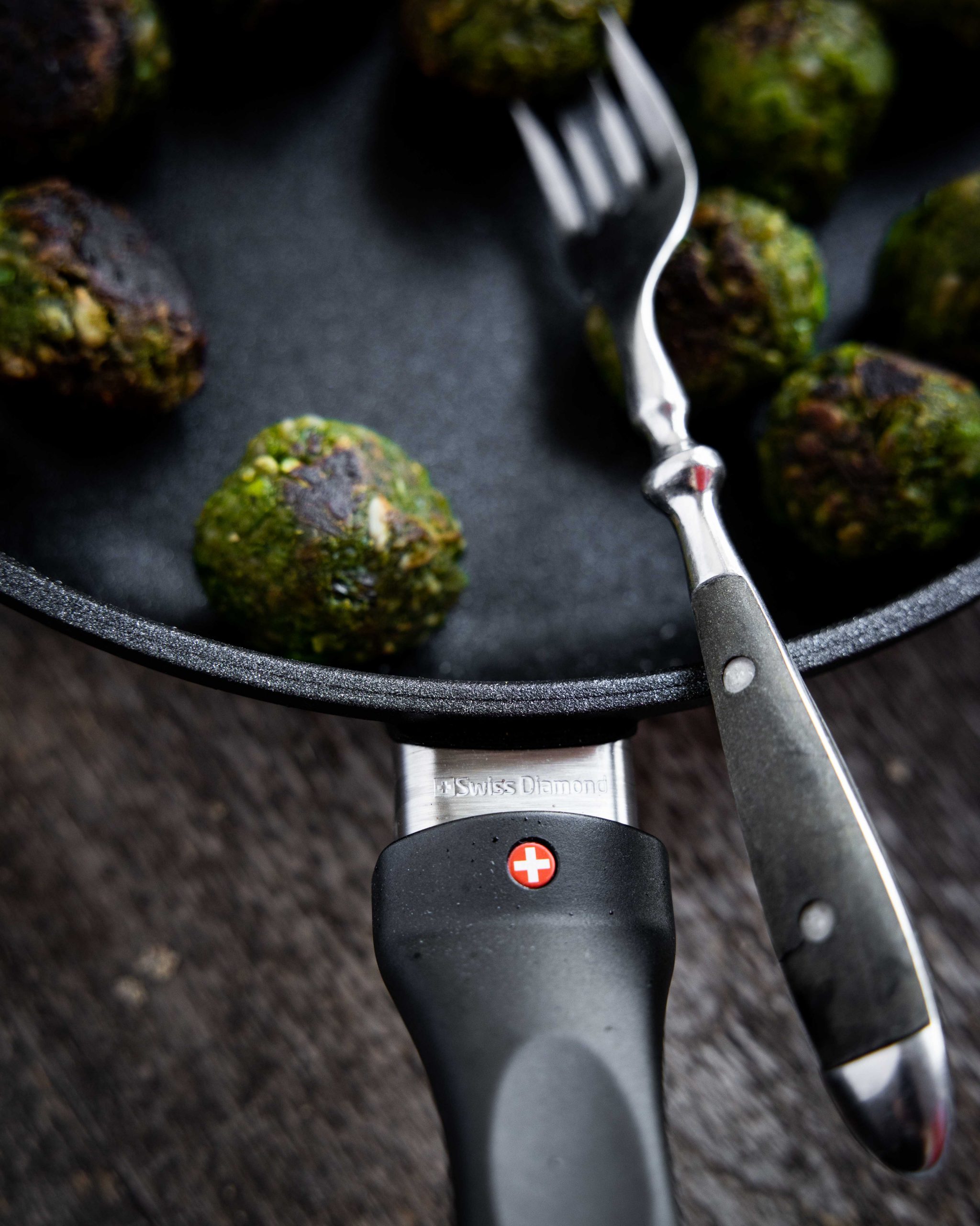 Nämäkin pyörykät ja muutkin kasvispullat ja -pihvit paistuvat helpoiten tarttumattomalla, pinnoitetulla (ja PFOA-vapaalla) Swiss Diamond -pannulla. Öljyäkää ei tarvitse paistaessa lotrata valtavia määriä!