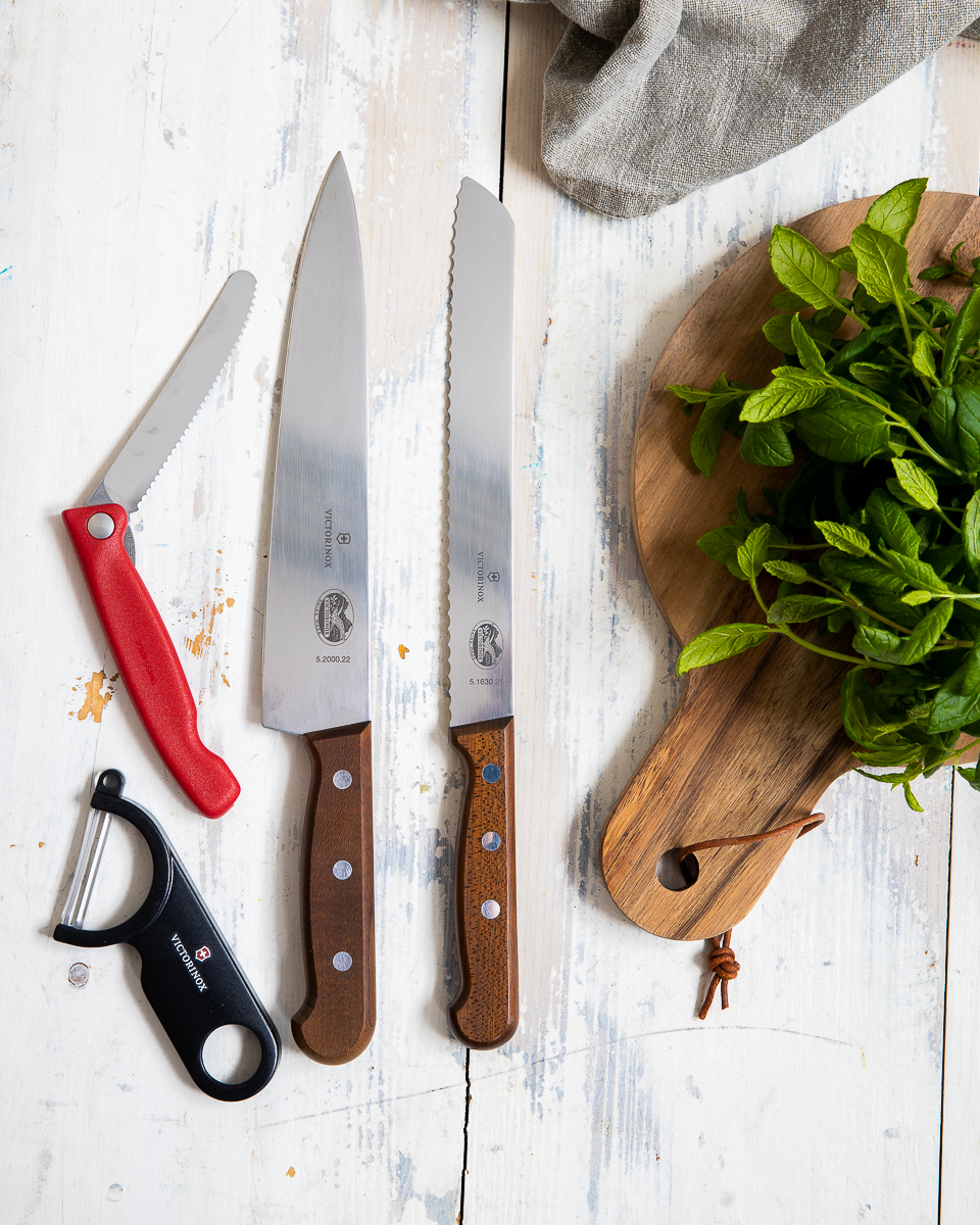 Alla olevassa kuvassa puolestaan on muutama uudempi veitsisuosikkini Victorinoxilta. Puukahvainen, hieman pienempiteräinen kokkiveitsi tuntuu toisinaan mukavammalta kädessä, ja sahalaitainen leipäveitsi on superhyvä erityisesti rapeakuoristen hapanjuurileipien leikkaamiseen. Victorinoxin puukahvaisia veitsiä ei muuten tarvitse erikseen öljytä, mikä helpottaa niiden hoitoa huomattavasti. Ja kuorija, ilman sitäkään keittiössä ei oikein pärjää ja tämä Victorinoxin kuorija toimii erityisen hyvin pitkulaisten kasvisten kuorimiseen. Toki jos haluaa pärjätä vain yhdellä, tämä Victorinoxin yleiskuorija on täsmävalinta. Tomaattiveitsestä on muuten olemassa myös tuollainen taittuvateräinen malli, joka kulkee näppärästi mukaan vaikka retkelle.