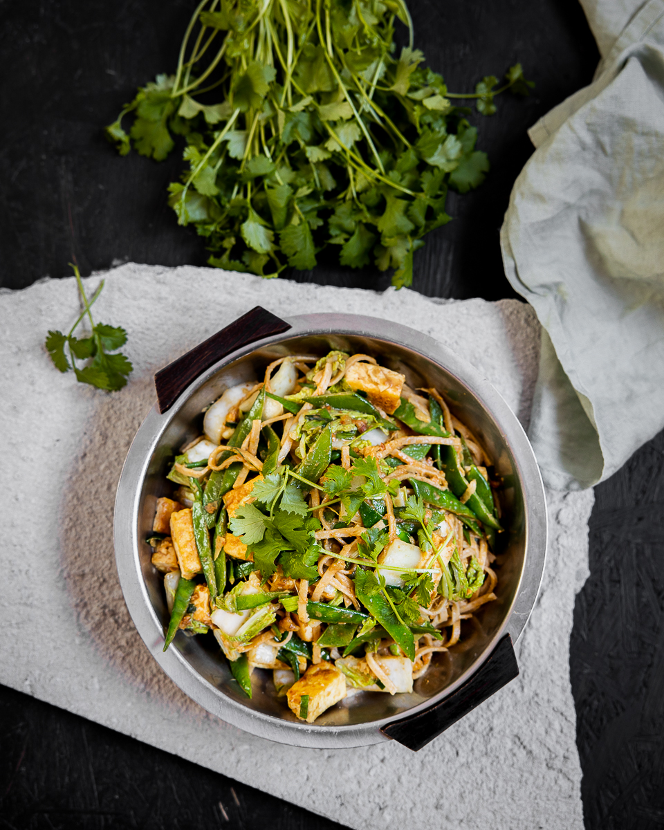 Nuudelit maapähkinäkastikkeessa on lohturuokaa parhaimmillaan. Tämä nuudeliruoka on täynnä herkullisia kasviksia ja tuhtia maapähkinäkastiketta. Ruoan voi valmistaa tofusta tai vegekanasta, tai jos haluat, miksei vaikkapa nyhtökaurastakin. Kasviksiakin tähän voi hyvin vaihdella jääkaapin sisällön mukaan: sokeriherneet voi vaihtaa parsakaaliin ja joukkoon voi laittaa myös tuoretta chiliä ja porkkanaa.