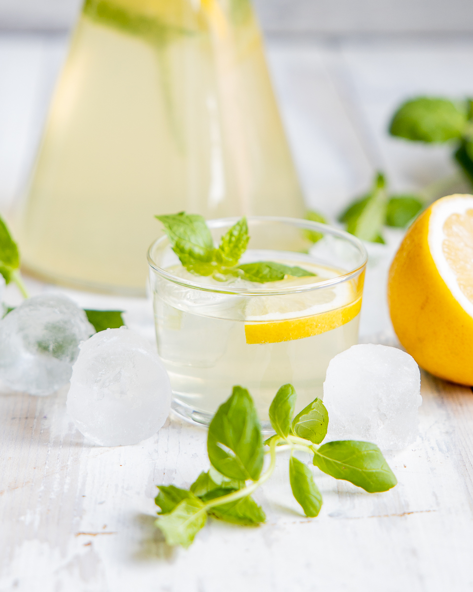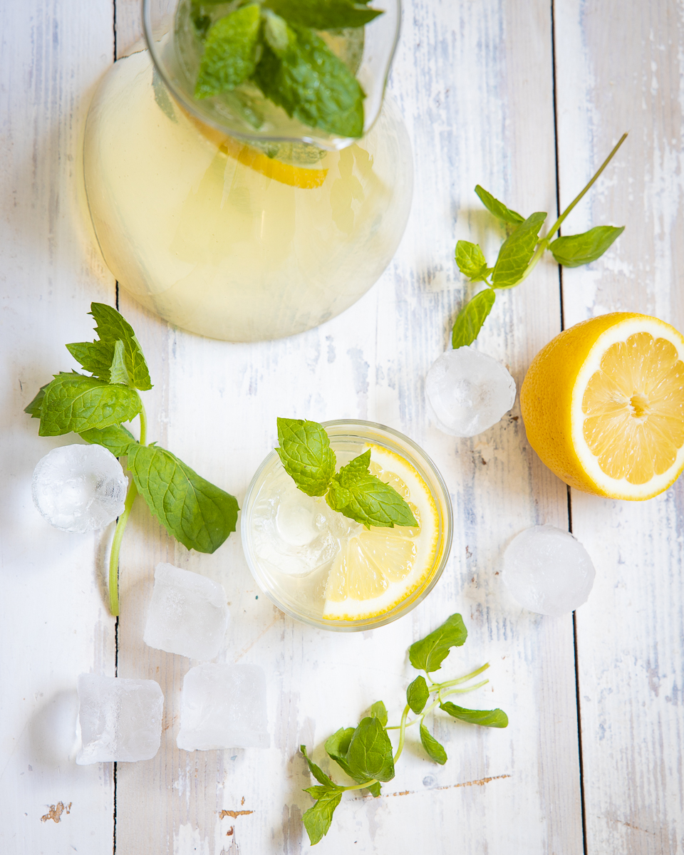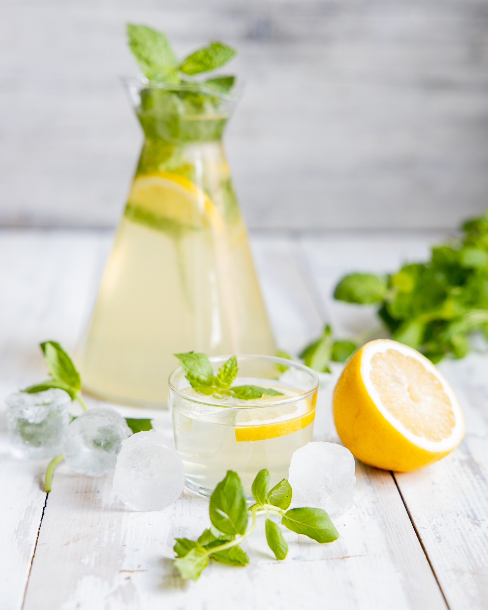 - Lisää sitruunaviipaleet ja mintunoksat ja jääpalat.