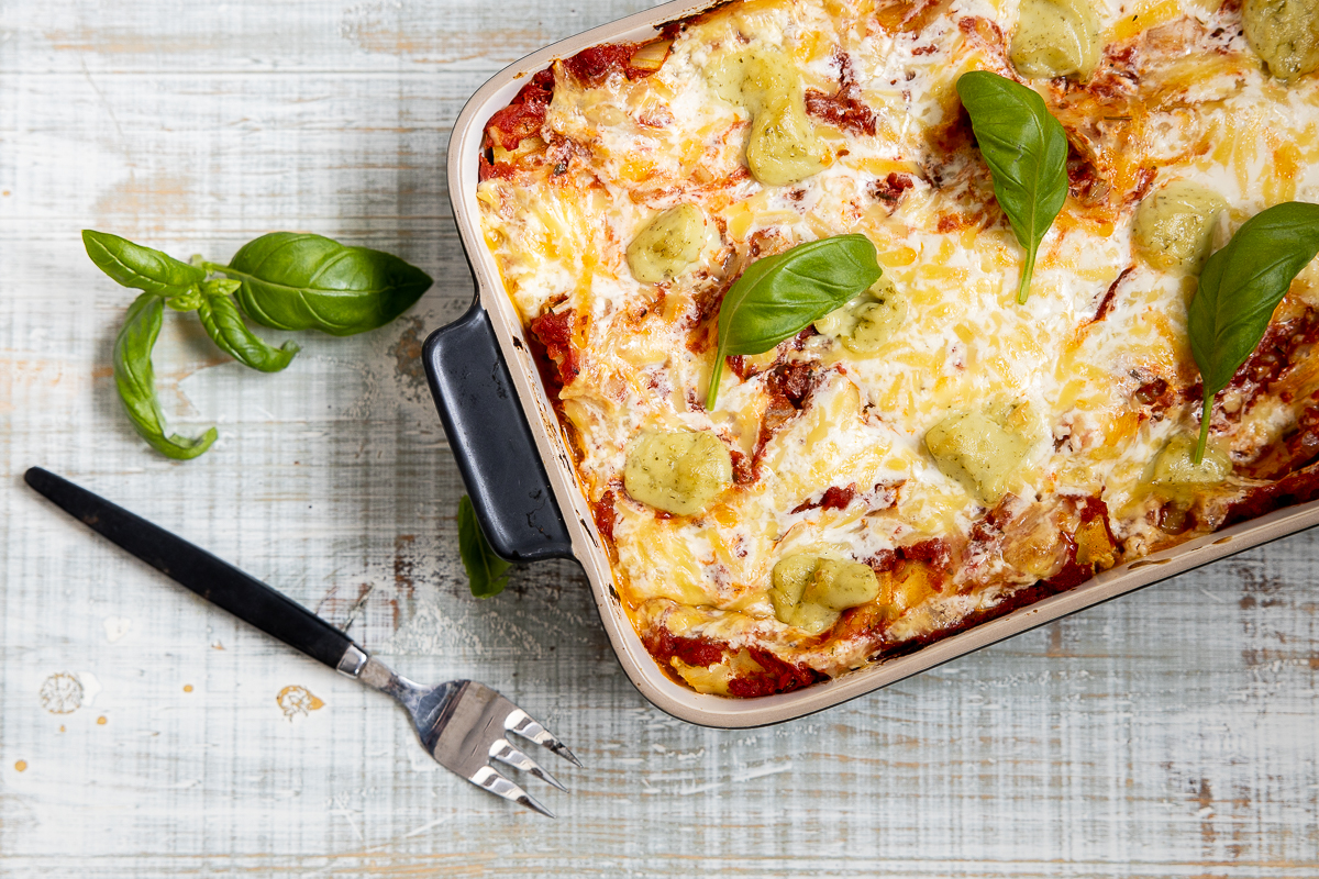 - Lusikoi uunivuoan pohjalle kerros tomaattikastiketta ja asettele täytetyt cannellonit vuokaan. Kaada loppu tomaattikastike joukkoon.