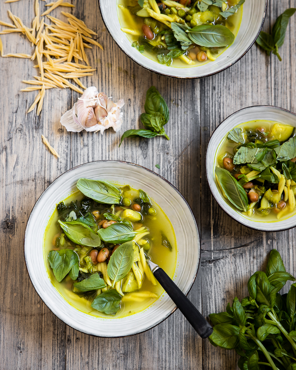 Minestronekeitto on yksi lemppareistani, mutta sitä tekee yleensä mieli syksyisin. Minestronekeiton hengessä voi tehdä myös tämän kesäisemmän vihreän version kasviksista, tuoreista yrteistä, pastasta ja pavuista. Kasviksia voi hyvin vaihdella sesongin mukaan. Tähän keittoon sopii mainiosti myös esimerkiksi parsa ja lehtikaalin voi korvata mustakaalilla.