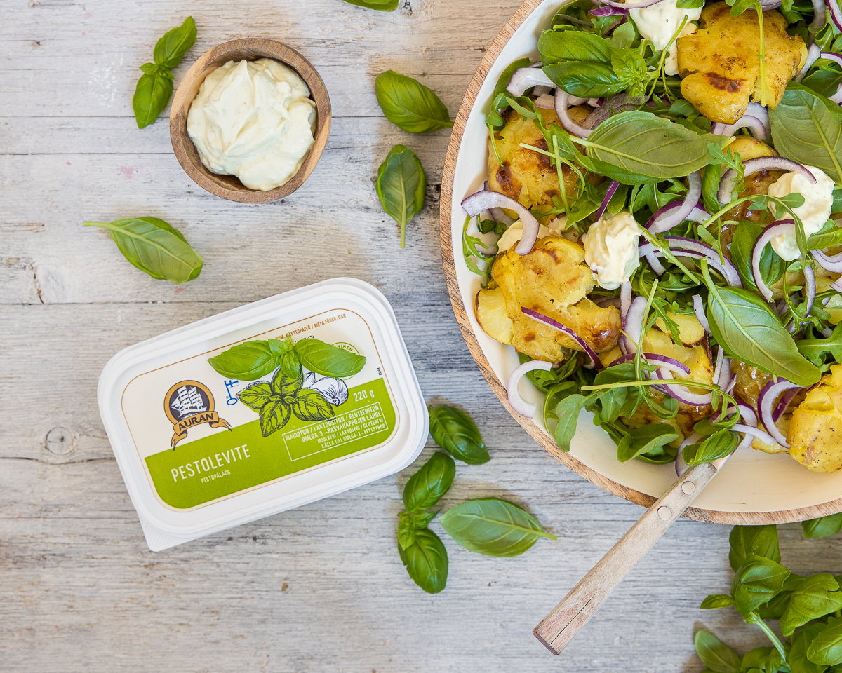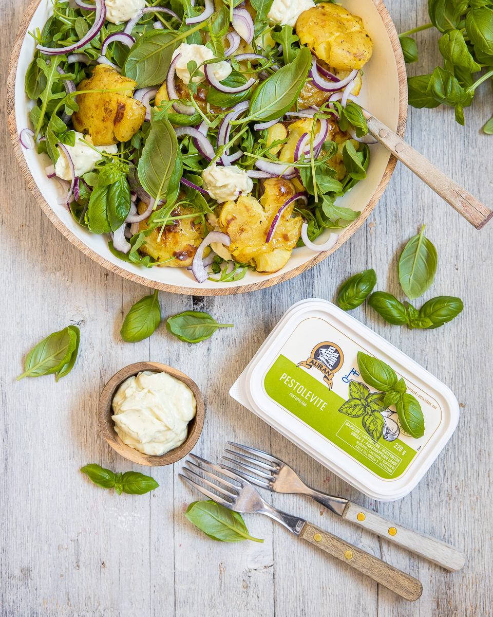 Kaupallinen yhteistyö Auran | Ihana kesäinen salaatti rapeaksi paahdetuista lyttyperunoista ja herkullisesta pestokastikkeesta.