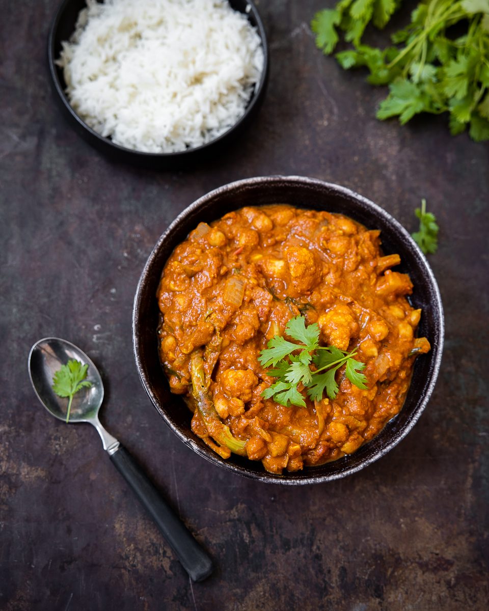 Kikherneistä, kukkakaalista ja maapähkinävoista syntyy herkullinen ja helppo curry.