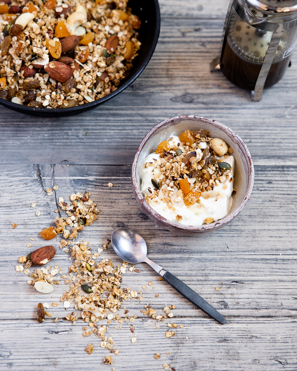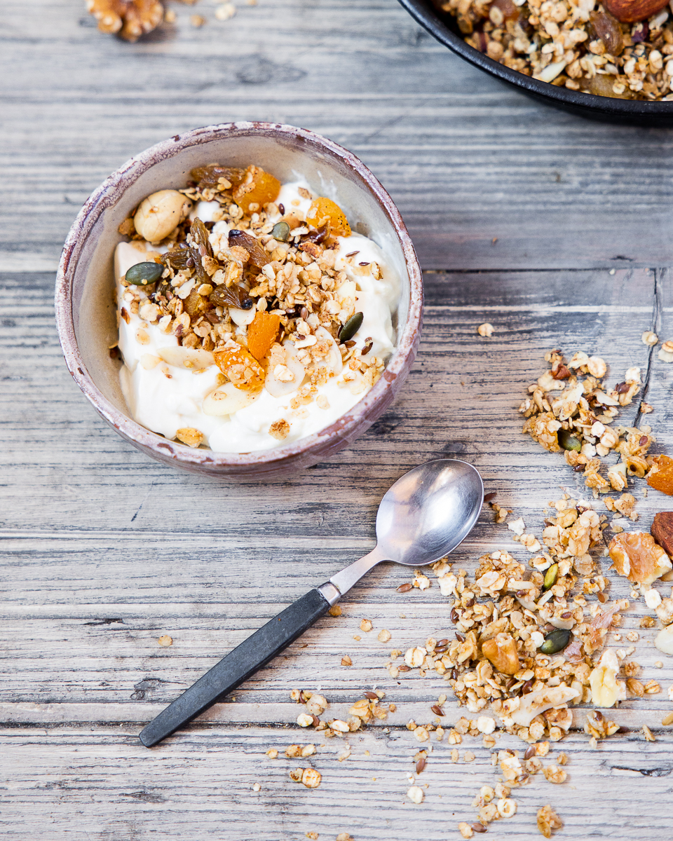 Paistinpannulla hetkessä valmistuva mysli on superhelppo tehdä ja samalla mainio tapa saada kaikki kaapeissa pyörivät pähkinäpussien pohjat hyödynnettyä. Pannumysliin sopii oikeastaan ihan kaikki kuivatut hedelmät ja -marjat, pähkinät, siemenet ja kookoslastut. Paras mysli tulee isoista kaurahiutaleista, mutta itsekin käytin tällä kertaa pikakaurahiutaleita kun niitä sattui olemaan kaapissa. Isoilla kaurahiutaleilla myslistä tulee hieman rapeampi, mutta muuten kaikki kaura- tai vaikkapa ruishiutaleet käyvät tähän oikein hyvin.