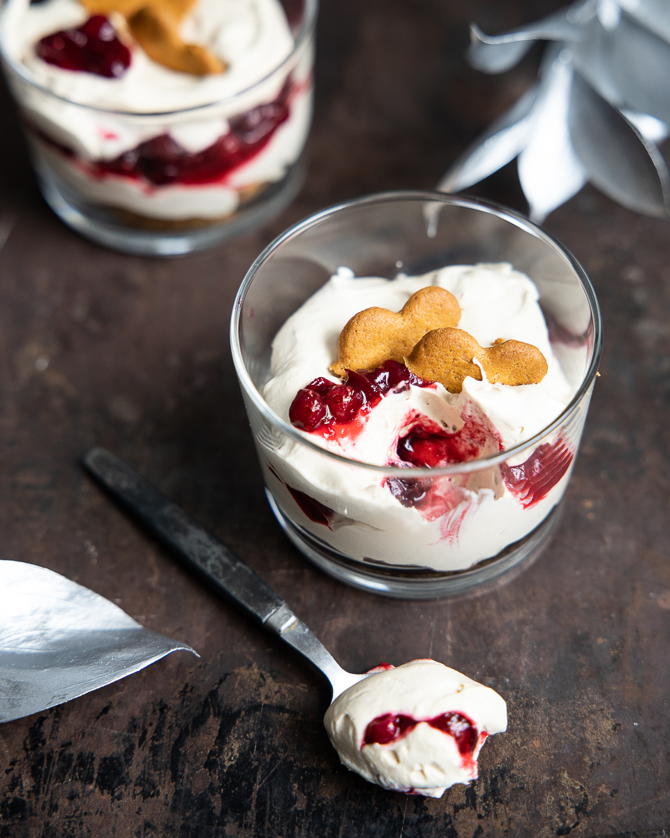 Rakastan tällaisia erilaisia kerrosjälkiruokia, koska niiden tekeminen on niin vaivatonta. Helppous-herkullisuus -suhde kohdallaan! Tässä jälkkärissa on Biscoff-tahnalla jalostettua kauravispiä, glögillä maustettuja karpaloita ja rapeita piparimuruja. Täydellistä!