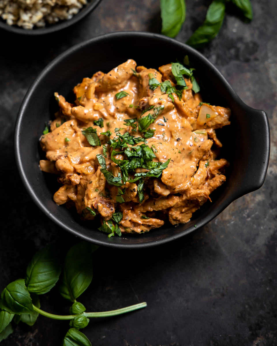 Aurinkokuivatuilla tomaateilla maustettu kermainen kanakastike vegaaniversiona.