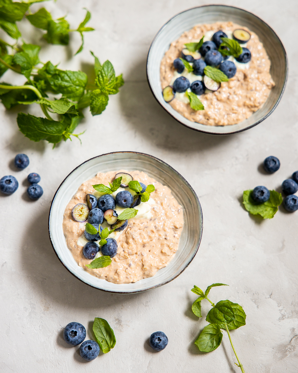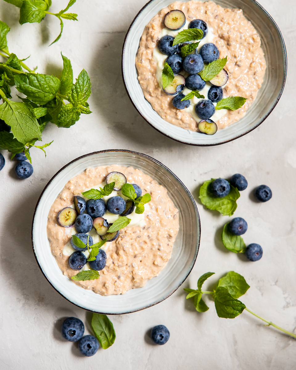 - Lusikoi puuro kulhoihin. Lisää päälle soijarahkaa sekä pensas- tai pakastemustikoita. Viimeistele halutessasi mintunlehdillä.
