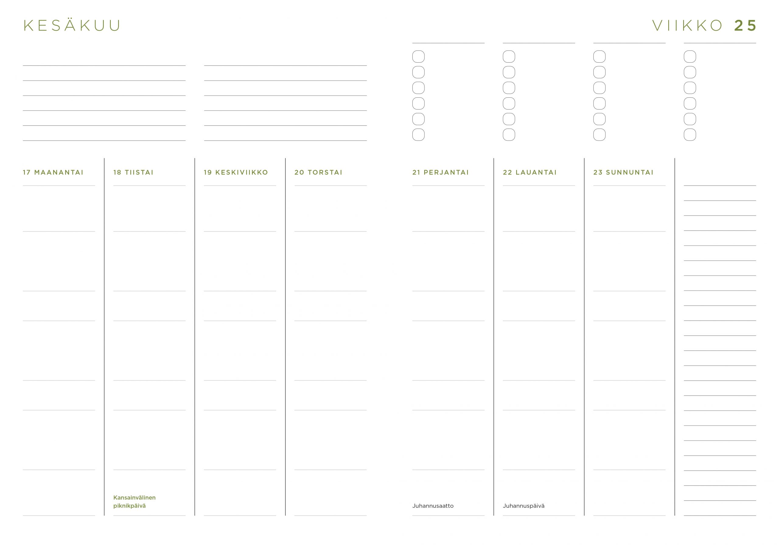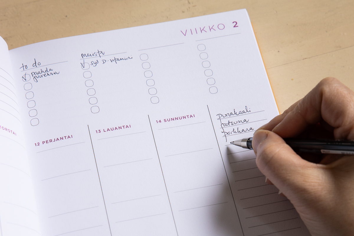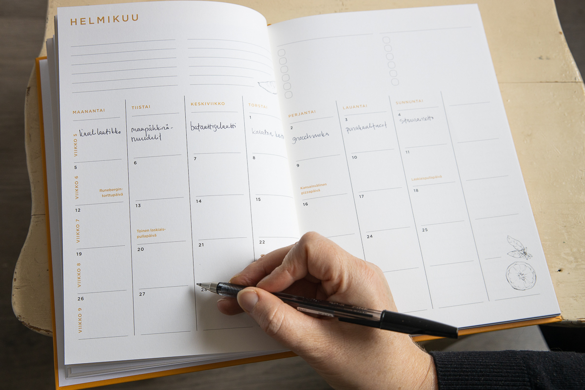 Kalenterin viikkonäkymän reunaan voit listata esimerkiksi syömäsi kasvikset tai käyttää tilaa muille merkinnöille. Jokainen päivä on jaoteltu löyhästi ateroiden mukaan – voit siis suunitella päivänäkymään aterioita aamupalasta iltapalaan tai käyttää sitä tavallisen kalenterin tapaan päivän menoihin.