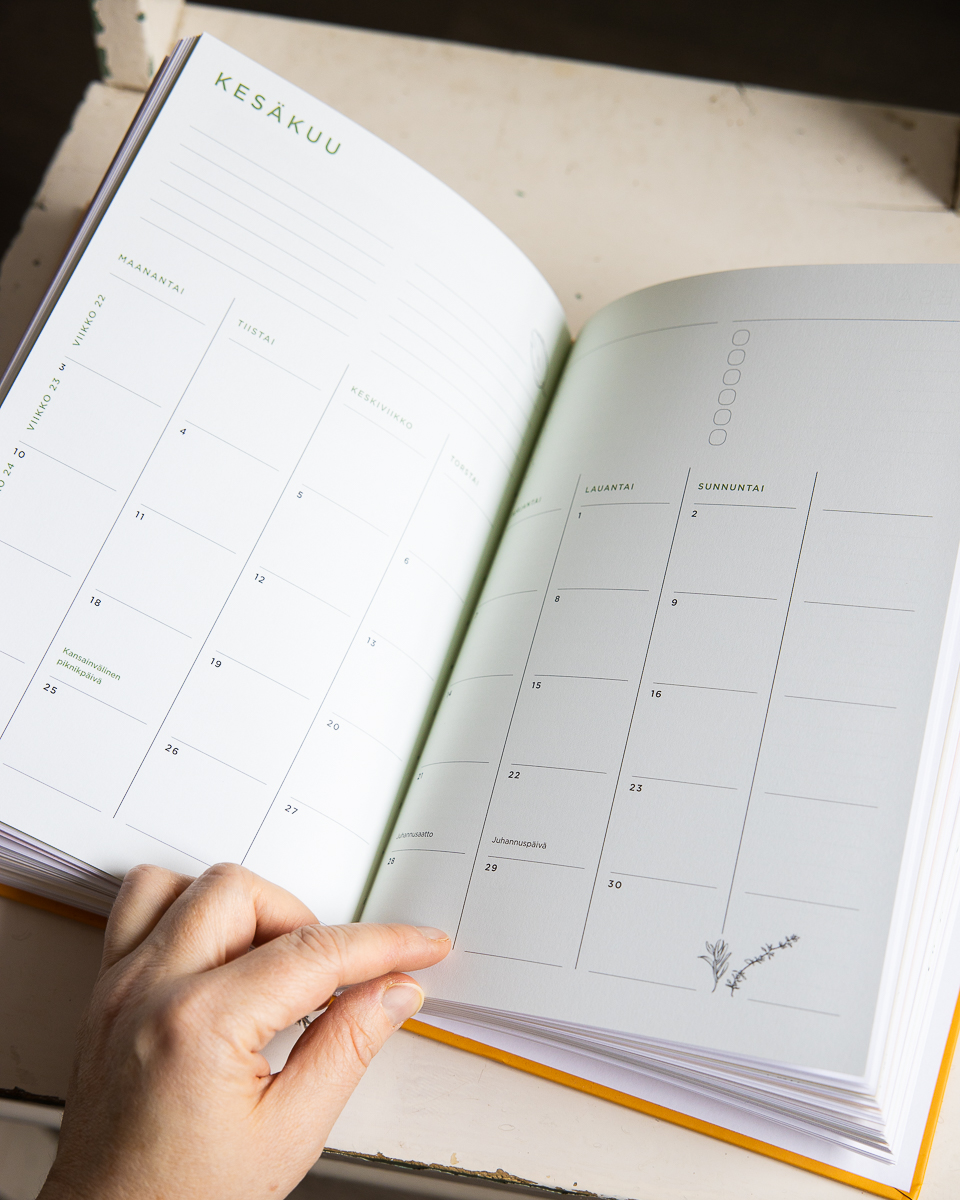Kalenterin visuaalisen ilmeen on suunnitellut superlahjakas kalenteriguru Satu Kontinen. Hänen kanssaan olemme toteuttaneen monta kirjaprojektia aikaisemminkin, mutta tästä tuli nyt mielestäni ihan erityisen hieno! Satu suunnitteli löyhistä ideoistani kalenterin toiminnot käytössä tosi hyviksi ja tietysti teki kalenterin ulkonäöstä tosi kauniin. Tästä tuli vielä parempi kuin osasin ikinä ajatella! Toivottavasti tekin tykkäätte tästä <3