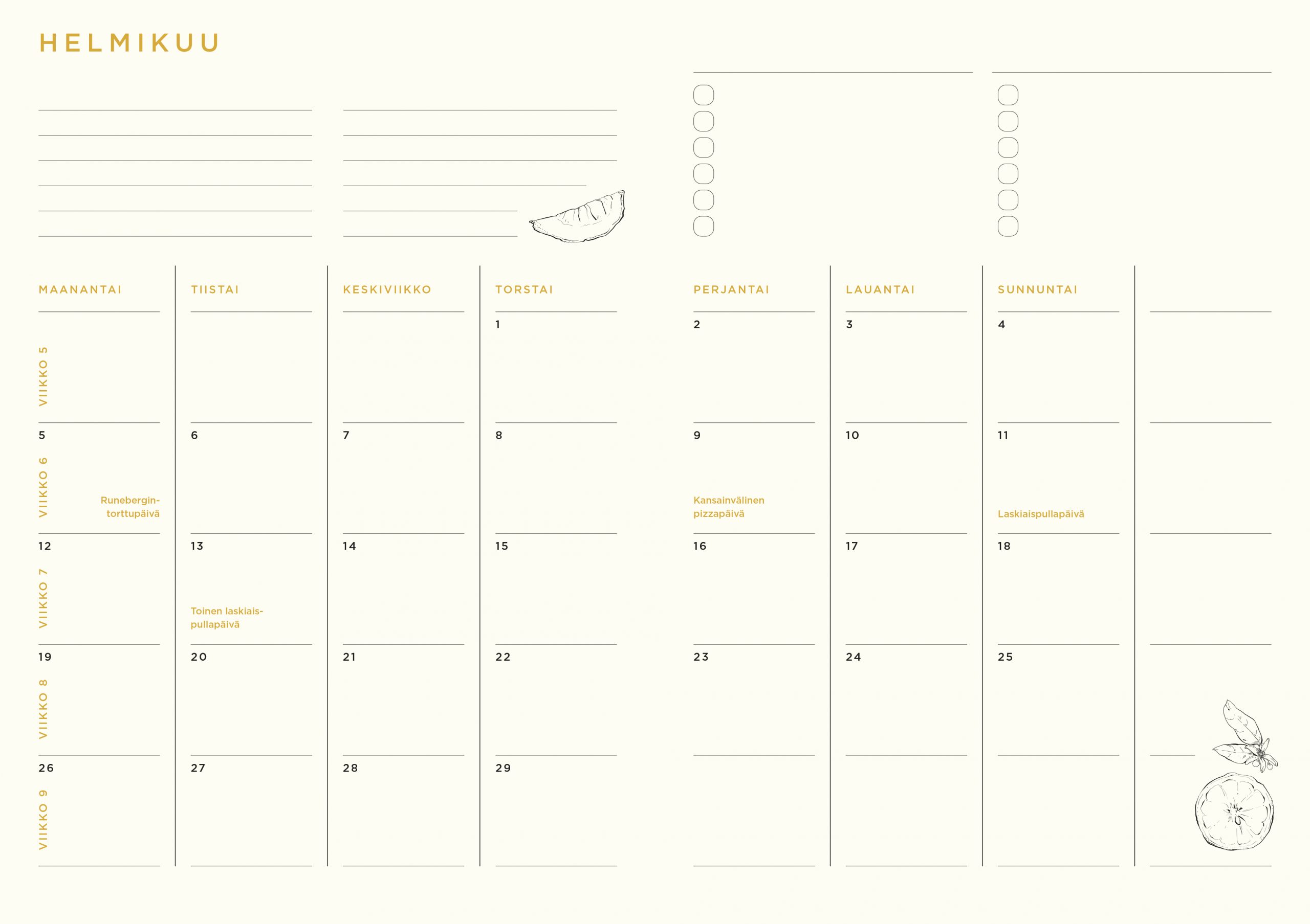 Kuukausinäkymään voit suunnitella esimerkiksi oman viikkoruokalistan.