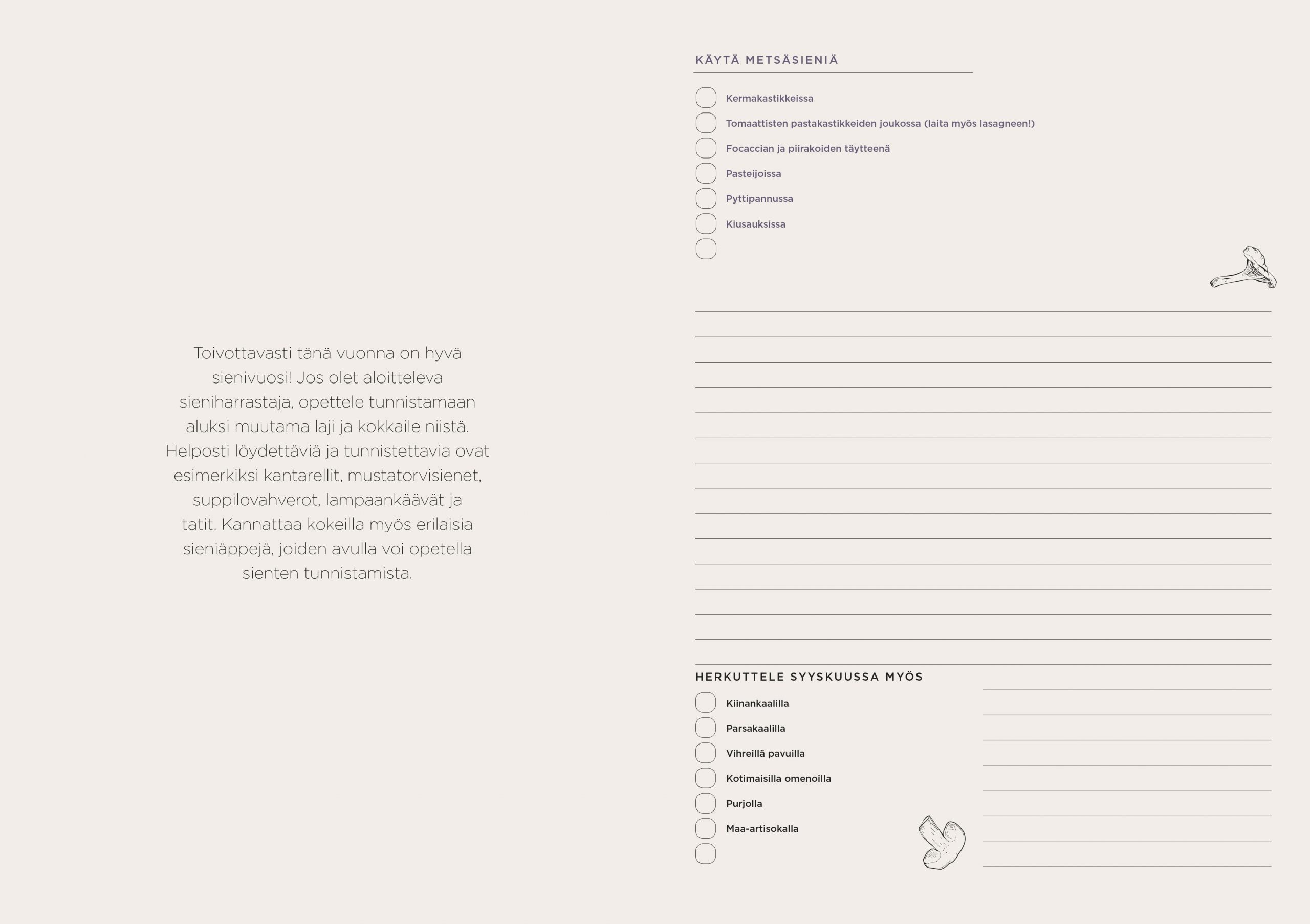 Chocochilin ruokavuosi sopii käytettäväksi ihan tavallisen kalenterin tapaan, sillä se on vapaasti muokattavissa omiin käyttötarkoituksiin sopivaksi. Kalenterissa on omille merkinnöille runsaasti tilaa, jota voi käyttää joko ruokasuunnitelmien tekemiseen tai muun elämän organisointiin. Chocochilin ruokavuosi toimiikin siis toivottavasti ennen kaikkea inspiraationa sesonkien mukaan syömiseen, uusien reseptien testaamiseen ja arjen hallintaan.
