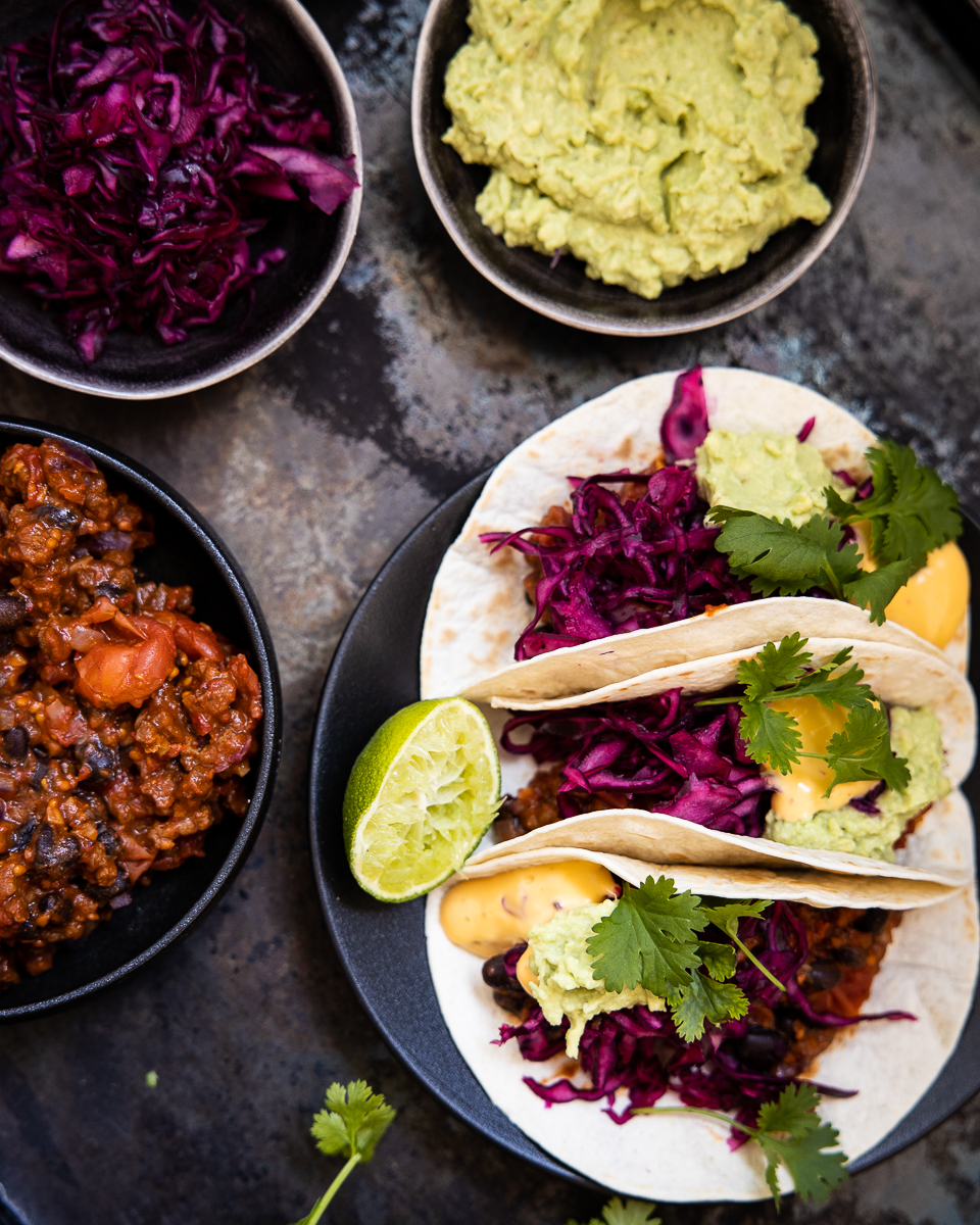 - Lämmitä lopuksi tortillaletut paistinpannulla. Täytä tacot härkistäytteellä, punakaalilla, avokadotahnalla sekä vegaanisella juustokastikkeella. Lisää korianteria halutessasi.
