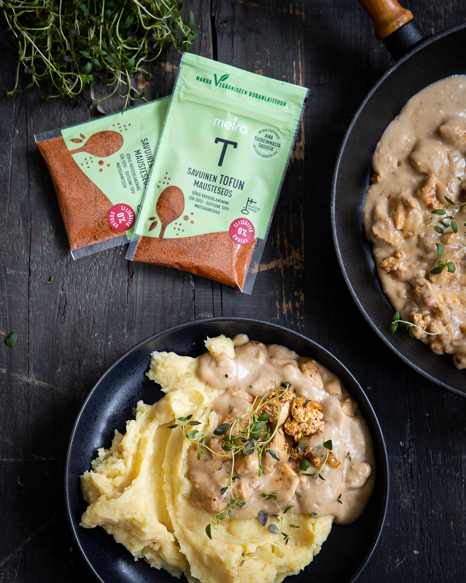 Kaupallinen yhteistyö Meira | Ruskea tofukastike on superherkullista misolla maustetun perunamuusin kanssa.