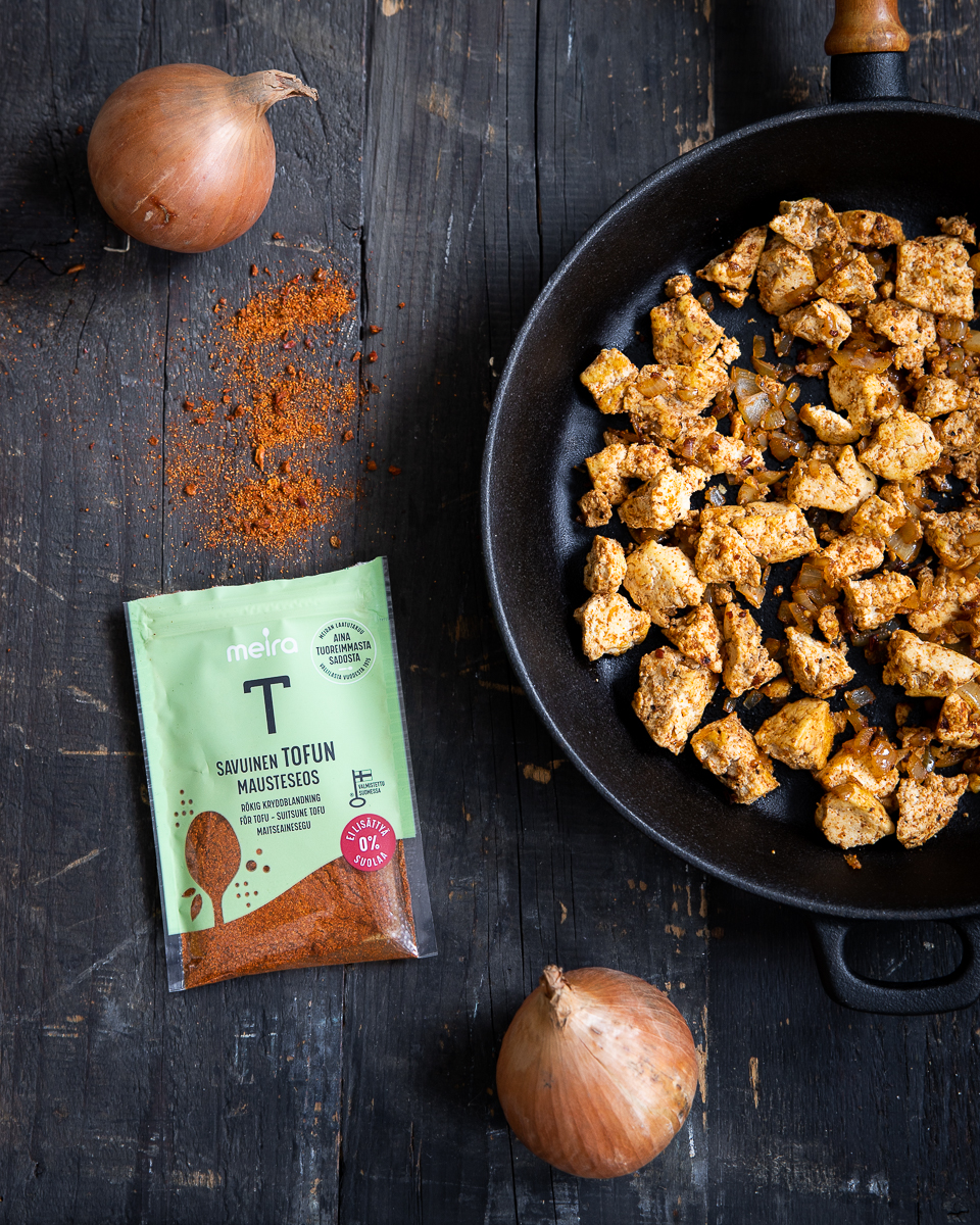 Kehittelin yhdessä Meiran tuotekehitystiimin kanssa tofulle toimivan perusmausteen, eli savuisen tofun mausteseoksen. Testailimme tästä monta eri versiota viime vuonna ja lopputuloksesta tuli tosi hyvä! Meiran savuinen tofun mausteseos on oiva perusmauste, joka sopii tofun maustamiseen moneen tarkoitukseen. Tällä mausteseoksella maustettu tofu sopii esimerkiksi makaronilaatikkoon, kiusauksiin, sellaisenaan salaatteihin, pasteijoihin ja erityisen hyvin ruskean kastikkeen joukkoon!