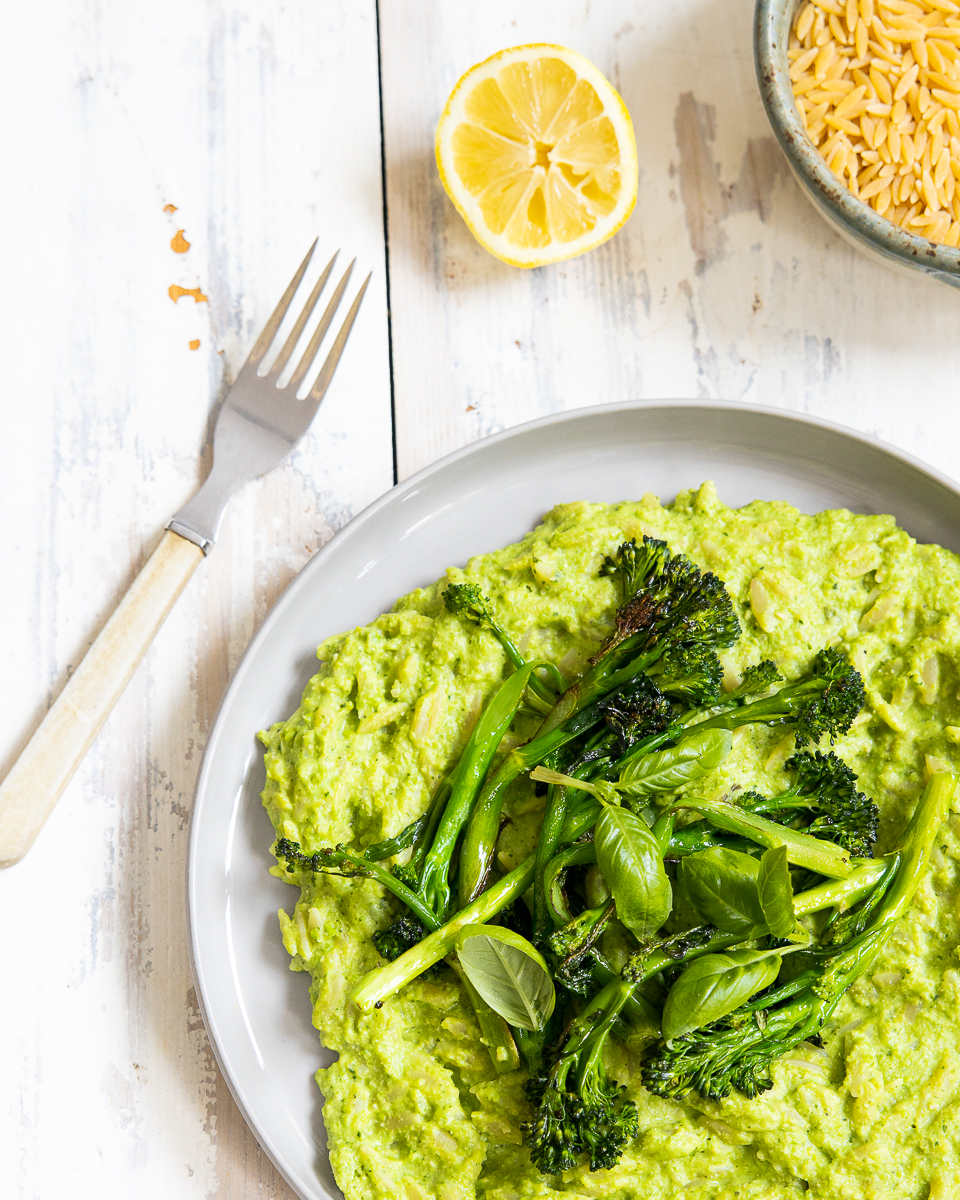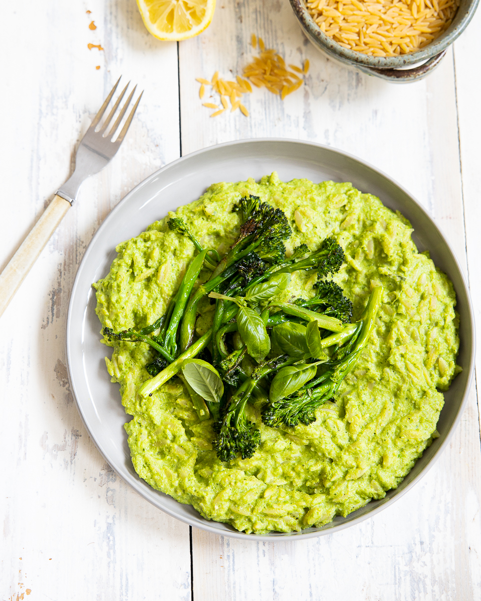 Orzo-pastaa hernekastikkeella ja varsiparsakaaleilla.